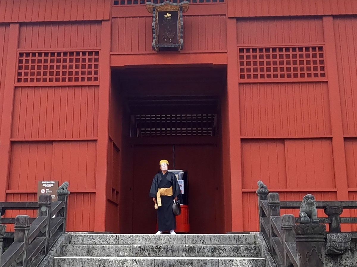 最初,ガイドの方の首里城の簡単な説明があり,次に琉球王朝時代の装束をまとった役人が門の前に立ち,ドラを鳴らして「うけーじょー」の声とともに門が開きます。朝早目に訪問予定であれば,これに間に合うように行くことをオススメします。