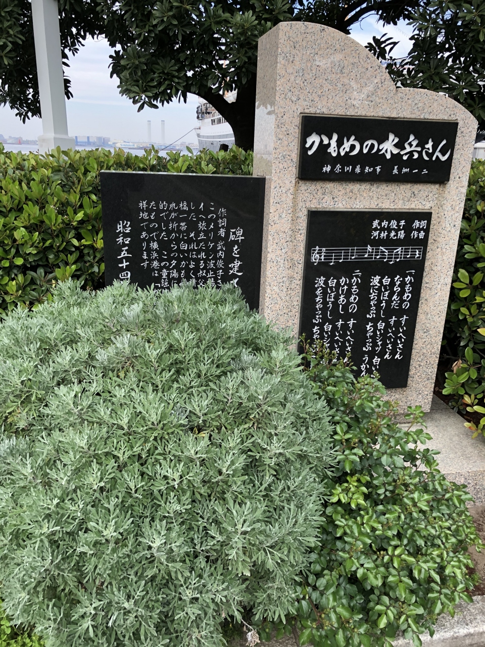 歌詞と、楽譜の一部を刻んだ歌碑です。石碑はりっぱなもので、きちんと掃除もされているのですが、小さな木が碑の手前にあるので、一部がちょっと見にくくなっています。場所は山下公園内の氷川丸の手前あたりなのでわかりやすいです。