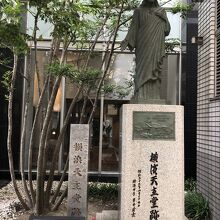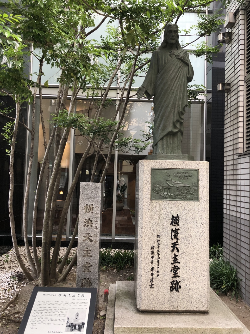 みなとみらいせん線の元町・中華街駅2番出口をあがったところにあります。石碑とキリスト像、天主堂の写真入りの説明碑がセットになってい設置されている、なかなかりっぱな