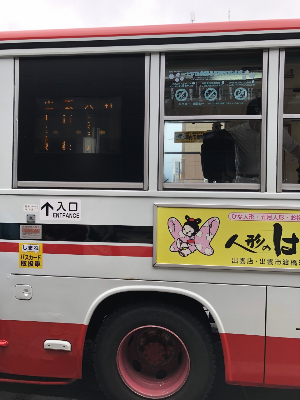 JR出雲駅から乗りました。出雲大社へ行く前に、重要文化財の旧大社駅を見学するのに一畑電車に乗るより便利だったからです。旧大社駅のすぐ近くに停留所があります。乗客は地元の人も観光客もいるといった具合でした。