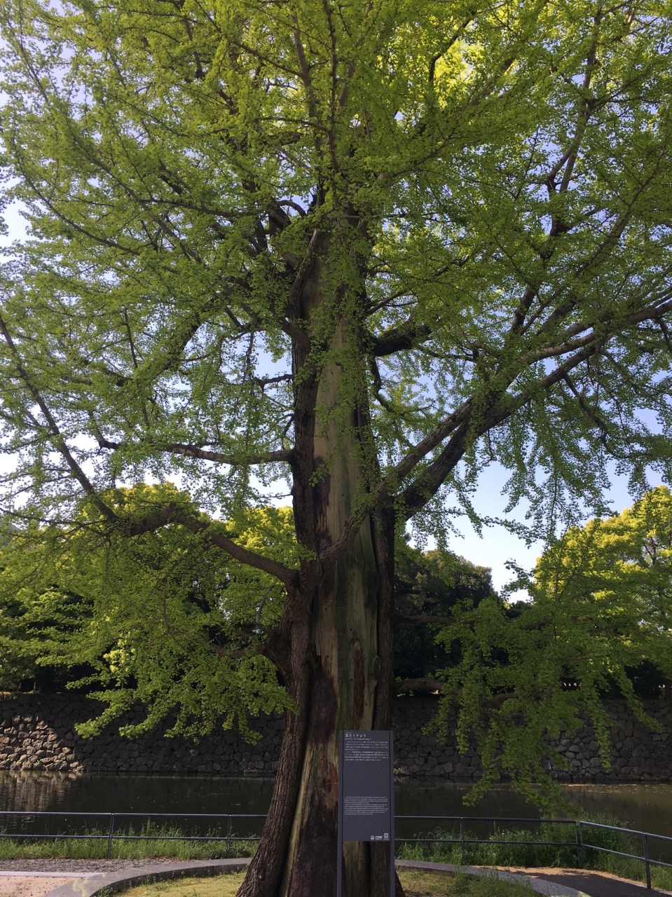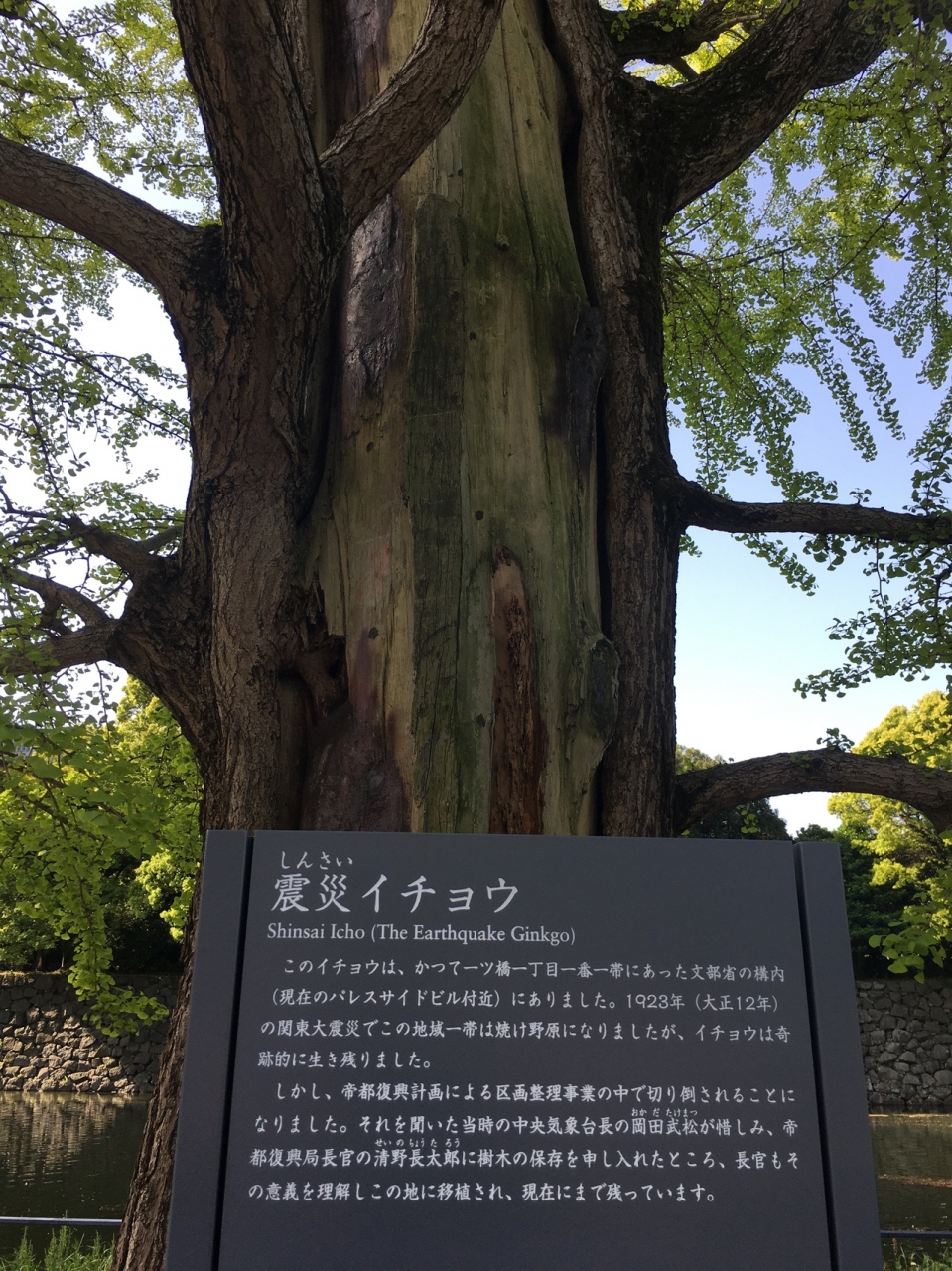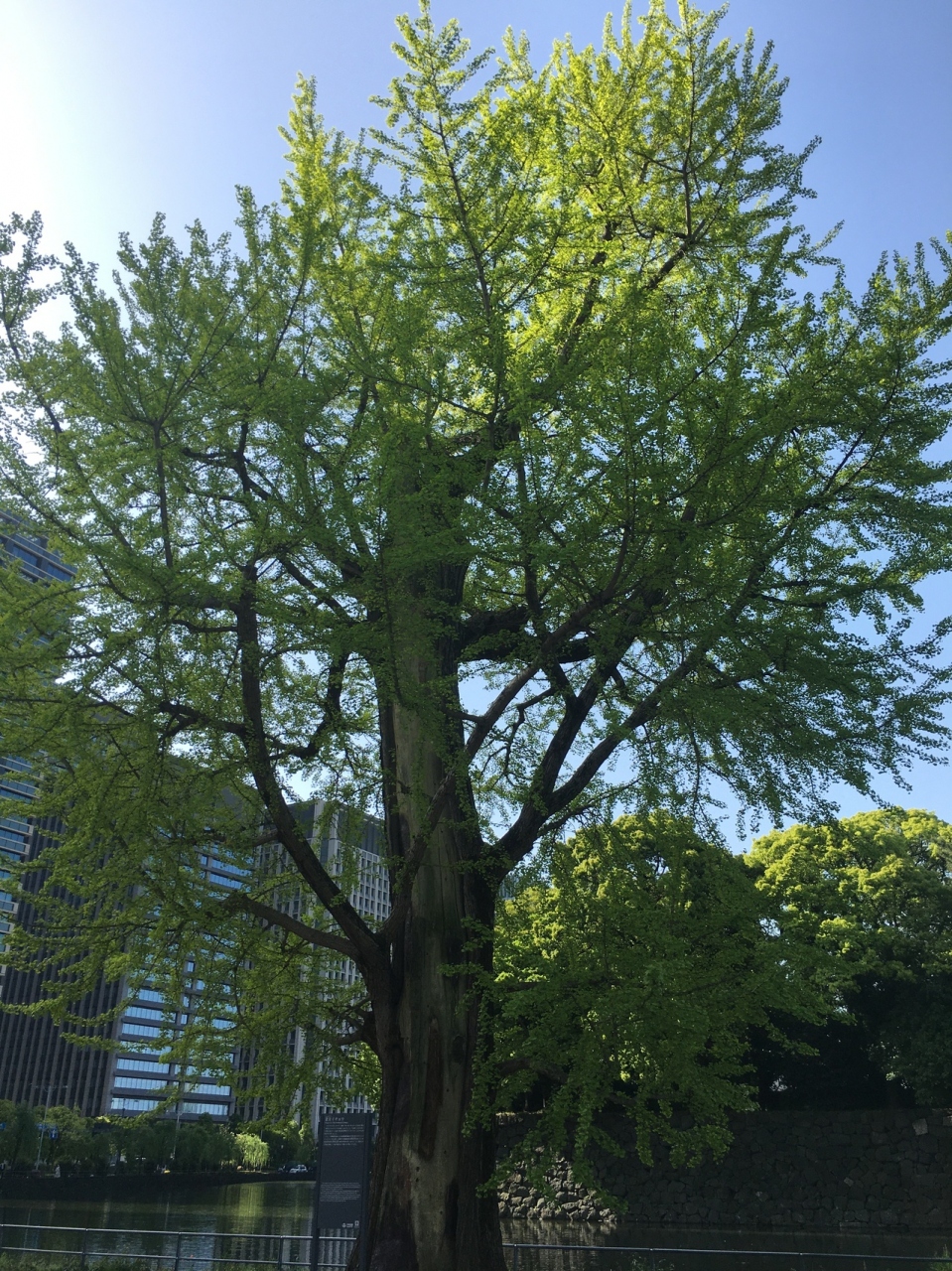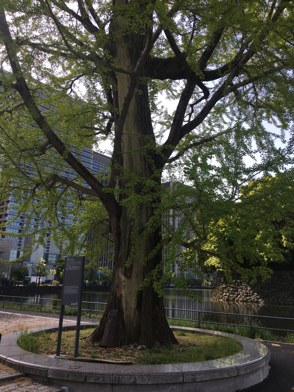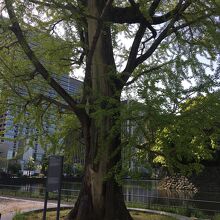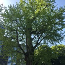 大手濠緑地の濠沿いに立っていました。関東大震災で奇跡的に残ったイチョウをこの場所に移植したものです。真っ直ぐではなく少し曲がった木で枝がたくさん伸び葉の新緑が見事でした。木はすこし削れたような箇所が目立ってるいました。