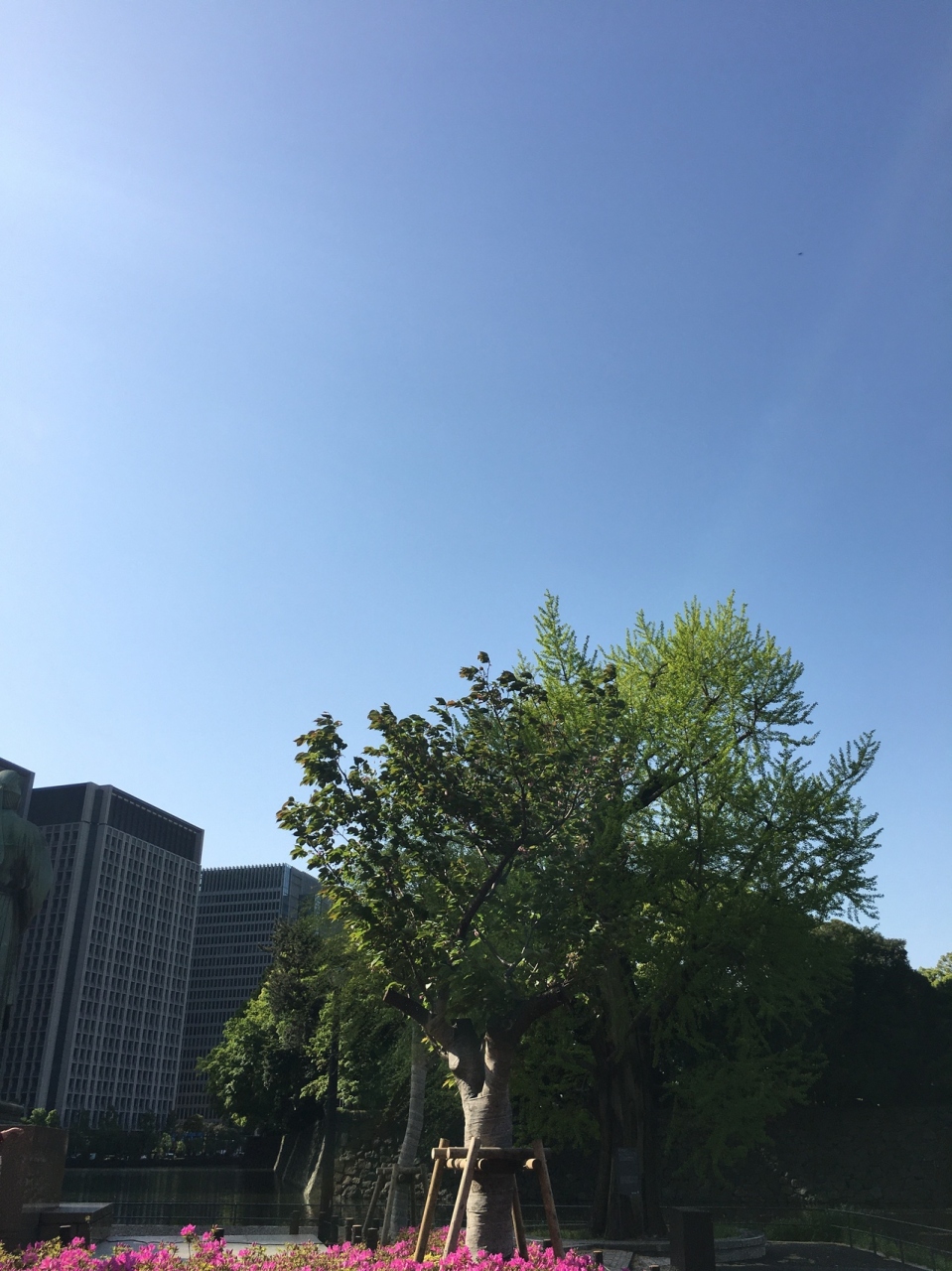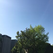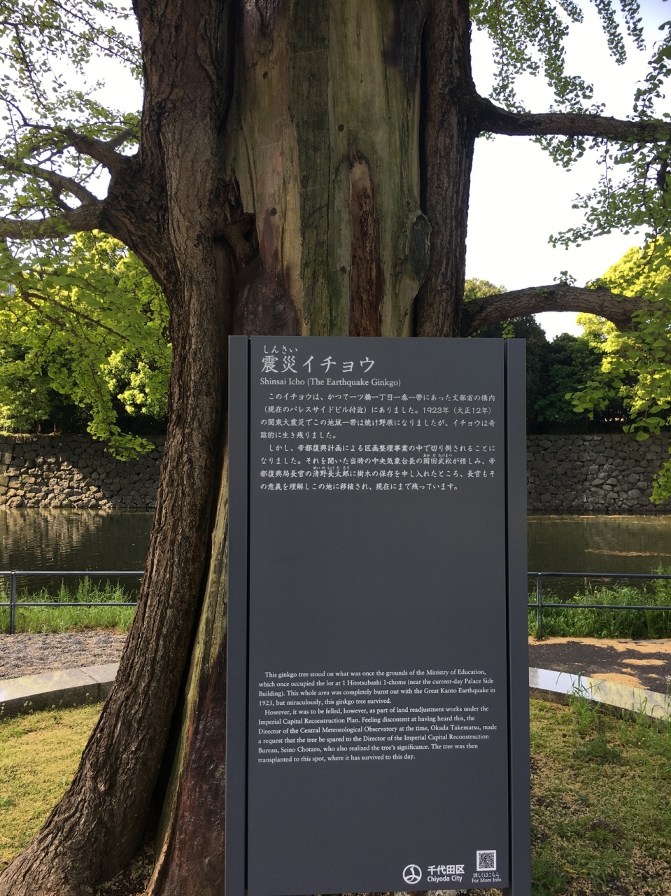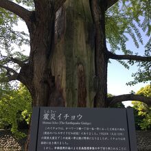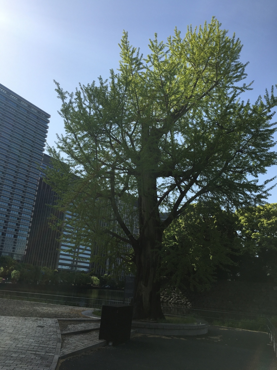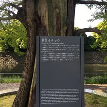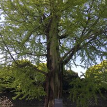 大手濠緑地の濠沿いに立っていました。関東大震災で奇跡的に残ったイチョウをこの場所に移植したものです。真っ直ぐではなく少し曲がった木で枝がたくさん伸び葉の新緑が見事でした。木はすこし削れたような箇所が目立ってるいました。