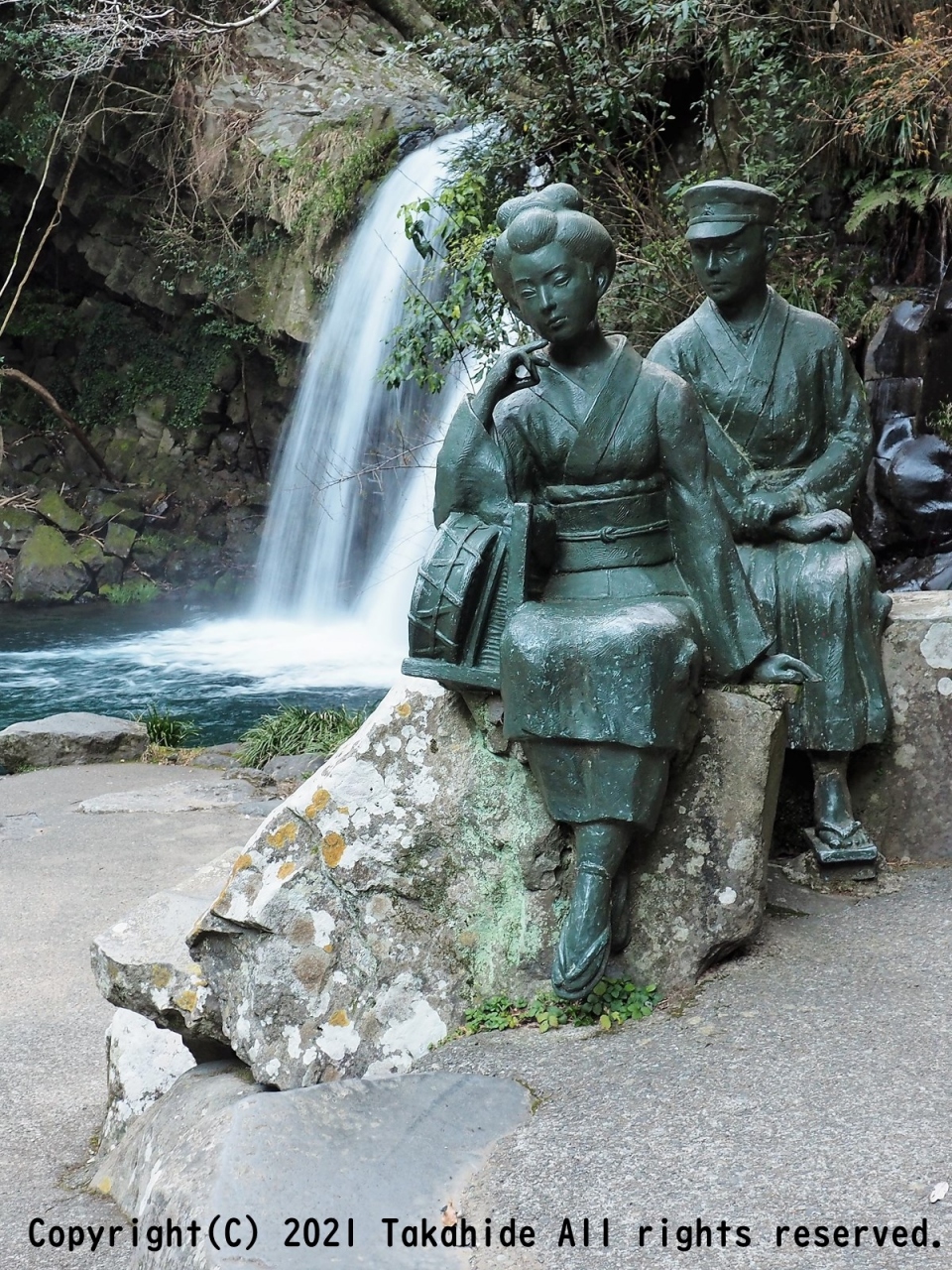 河津七滝を紹介する写真によく登場する『伊豆の踊子』にちなんだ「踊子と私」の像が滝の手前にあります。