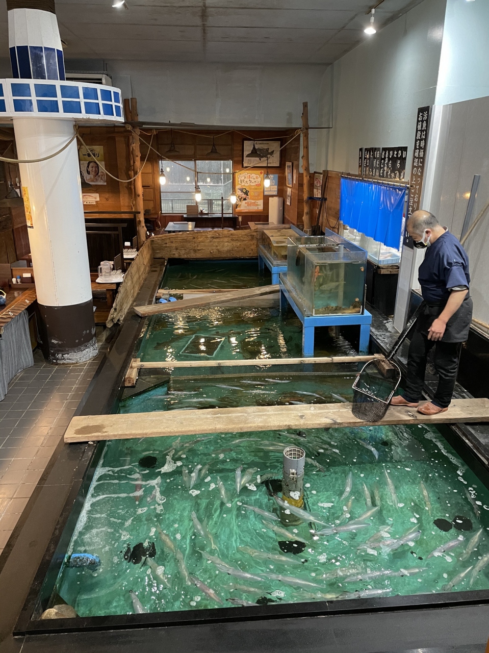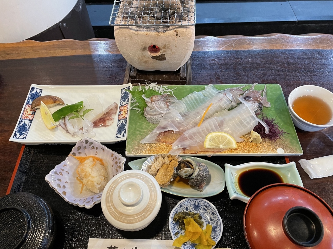東萩駅から川を渡ってすぐ、灯台が目印の巨大な生簀を持つ海鮮料理店です。中でもイカが一番人気です。いかづくしは、活きイカ、イカ焼き、後造りの天ぷらまたは塩焼き、茶碗蒸し、小鉢、ごはん汁物がついています。