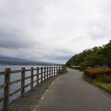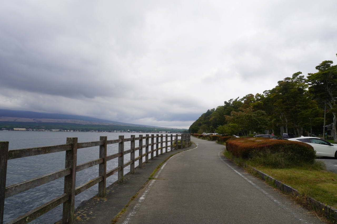 山中湖は一周およそ14km。山中湖のサイクリングロードはその湖畔に整備された道。富士山と山中湖を両方望める眺めのよさと平坦で道幅も十分。整備もいいですね。サイクリングだけじゃなくて、歩いている年配夫婦の姿も見えましたが、それもありかなと思います。