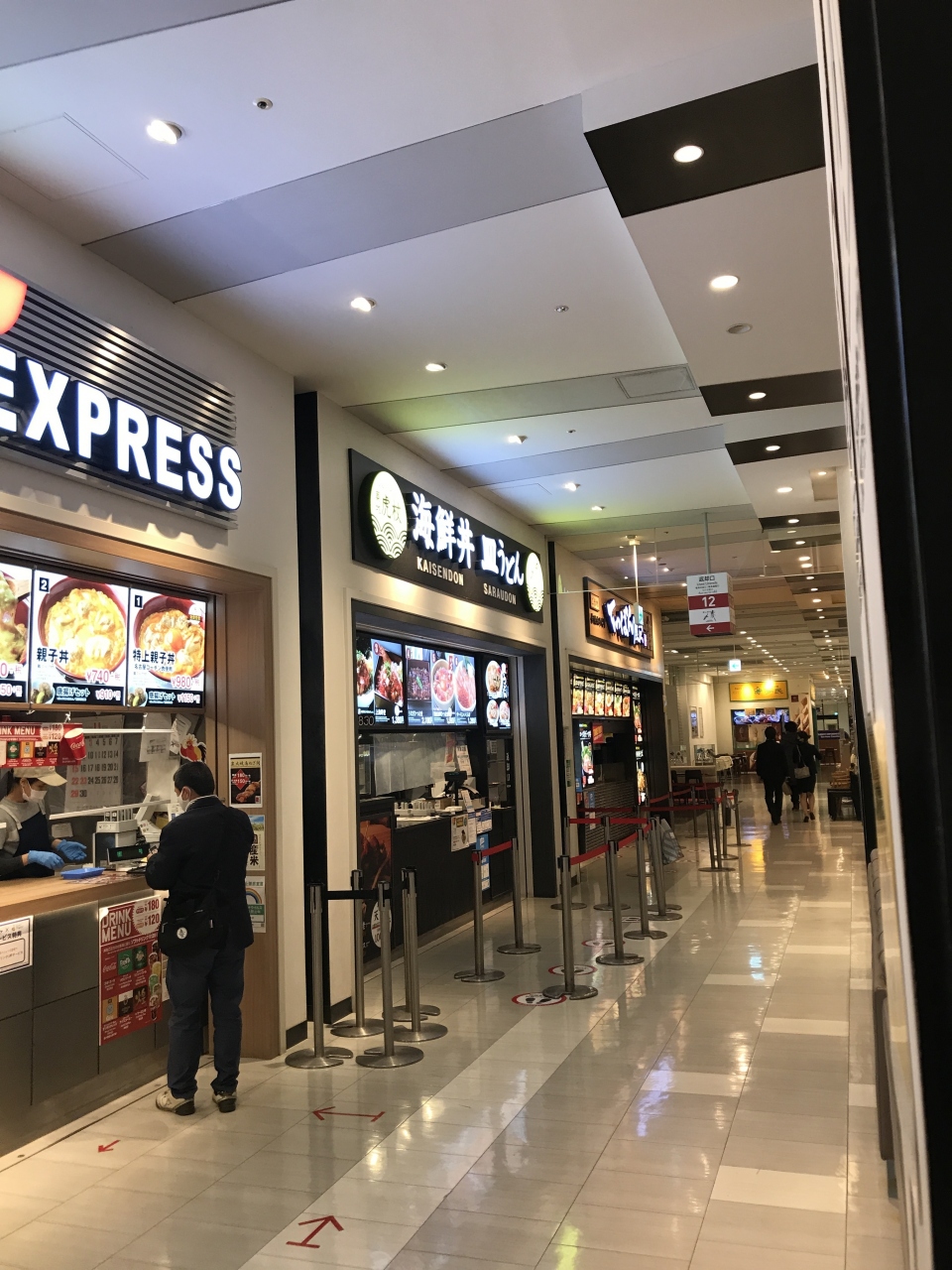 ダイバシティー東京ぷらざの1階にある大きなフードコートです。普段なら混雑していて席を確保してからお店に並ぶ感じでした、この時節のため、ガラガラのスタジアムを初めて見ました。他人との距離間は心配なくとることができました。