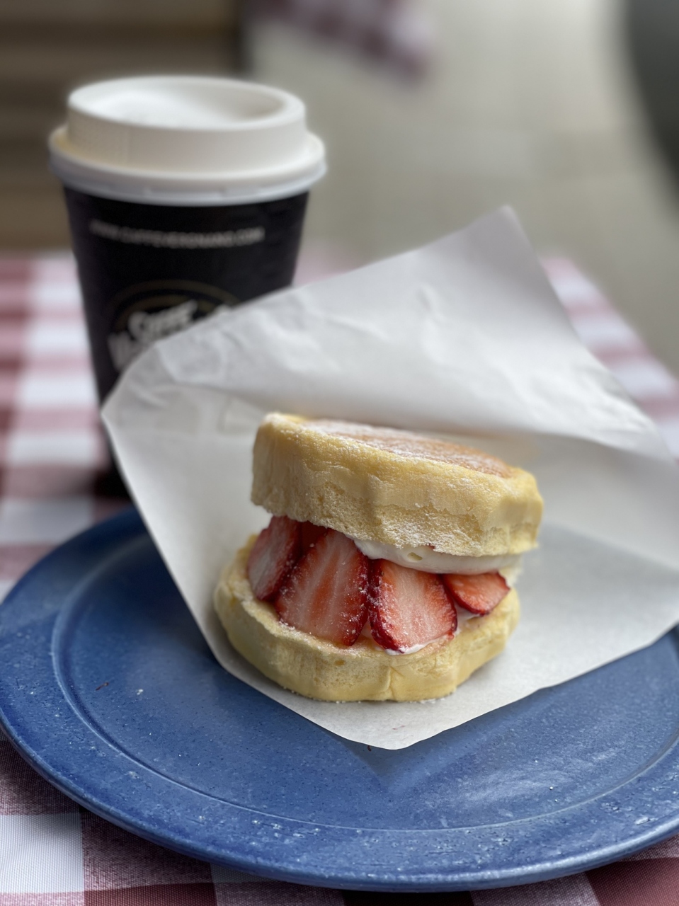 パンを使った軽食のほかスイーツ、ドリンクなどがラインナップ。カウンターでオーダーして会計士番号札を受け取り着席するセミセルフ式。小さなスフレパンケーキにイチゴとクリームをサンドしたデザートを注文。ドリンクはテイクアウト用の紙カップ。立地が良く開放的で使いやすいと思う。