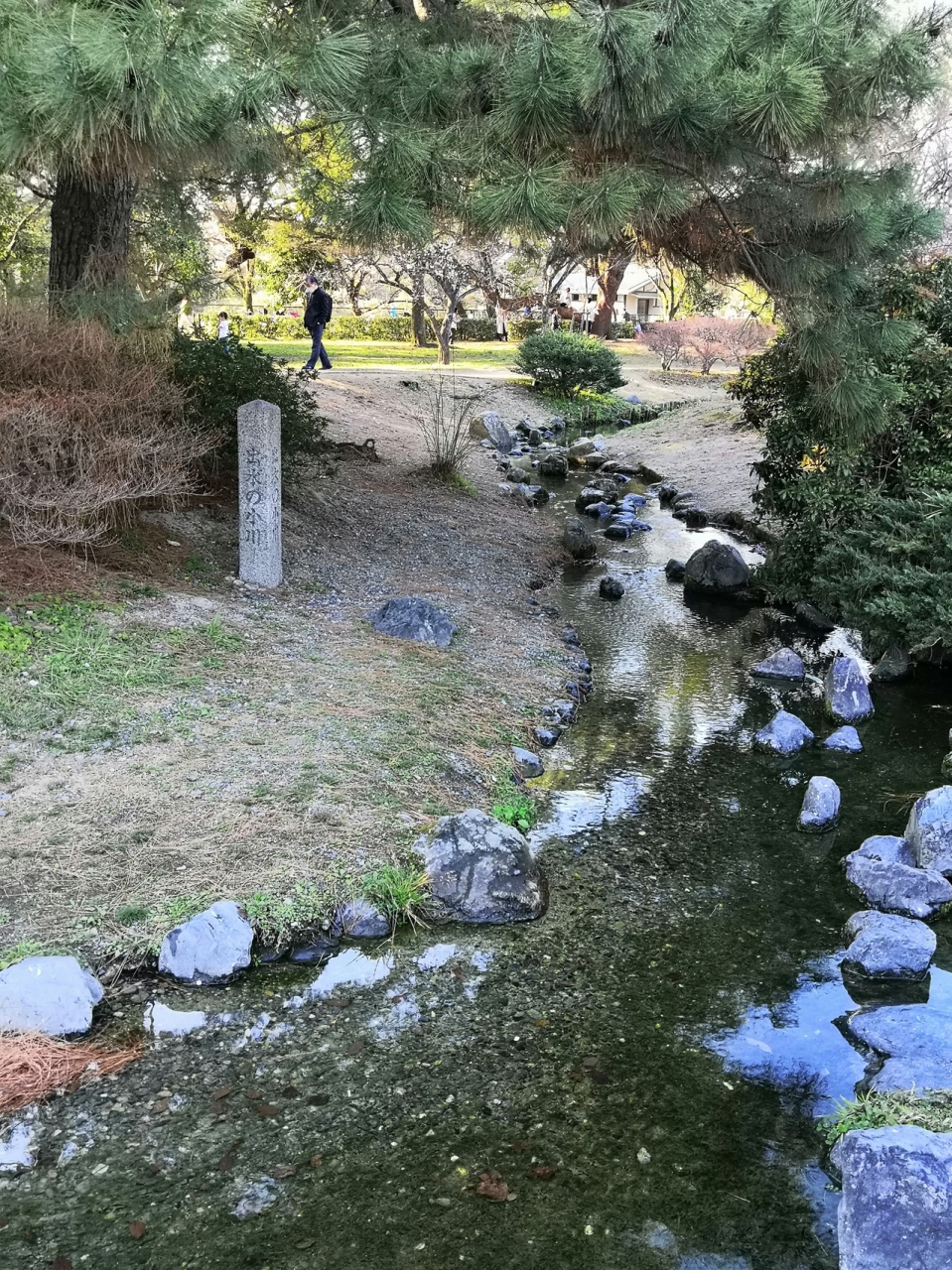 京都御苑の梅林の南側にあります。100mほどの長さの人工の小川です。週末ということもあって地元の子供たちの遊び場になっていました。特に風情があるというほどのものではないですが、それでも清々しい感じはありますね。