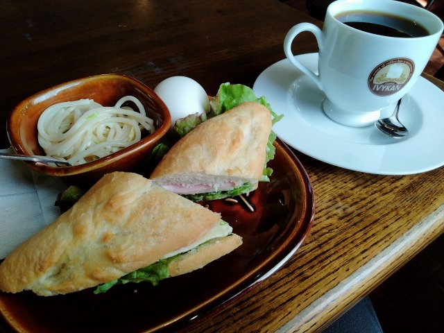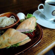 Cモーニング(バケットサンド(チーズ+ハム)+ミニサラダ+ゆで卵:500円)をいただきました。