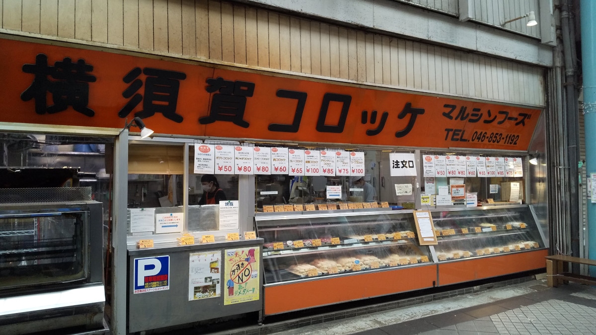 「横須賀コロッケ」の看板に「?」、続いて「マルシンフーズ」の看板にも「!?」