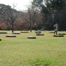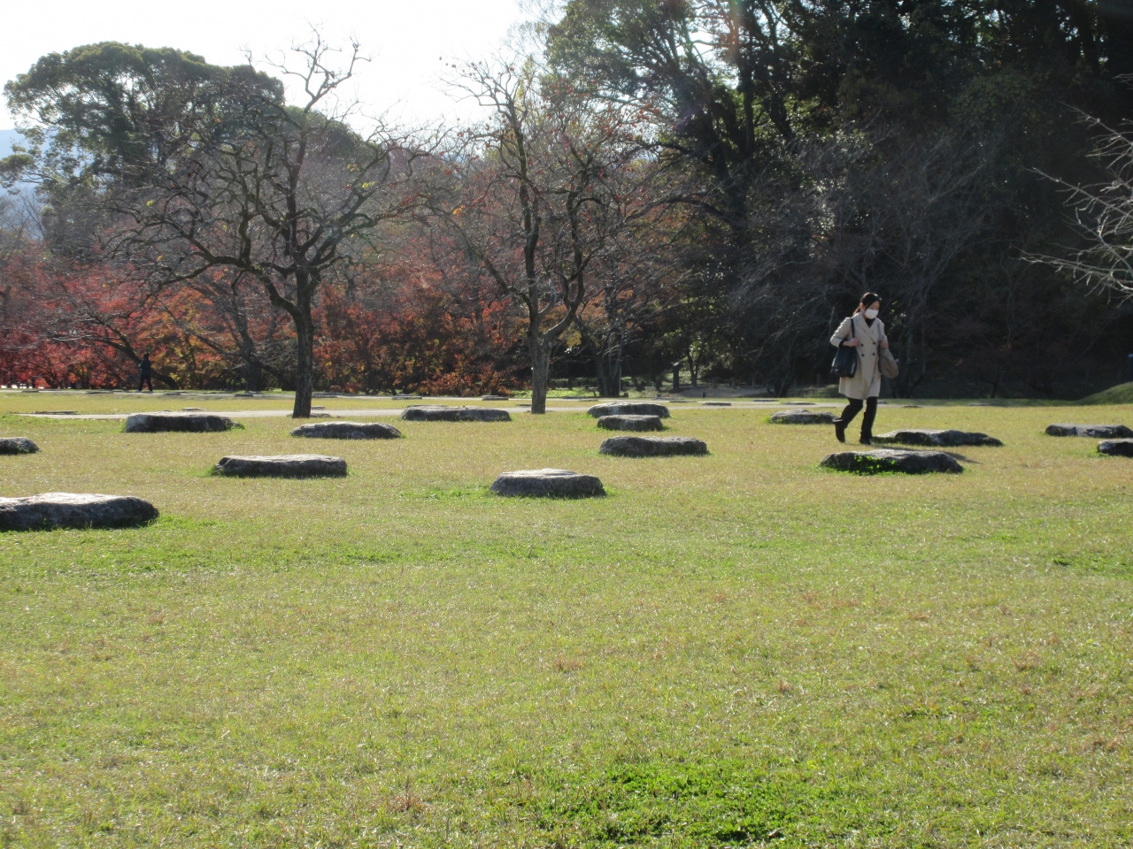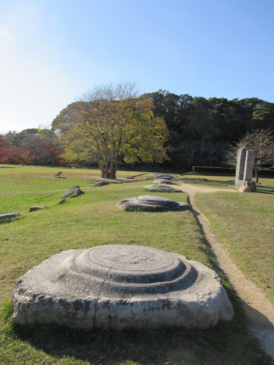 現在は大きな公園内に太宰府庁建物の基礎にあたる大きな石がポツポツと並んでいます。