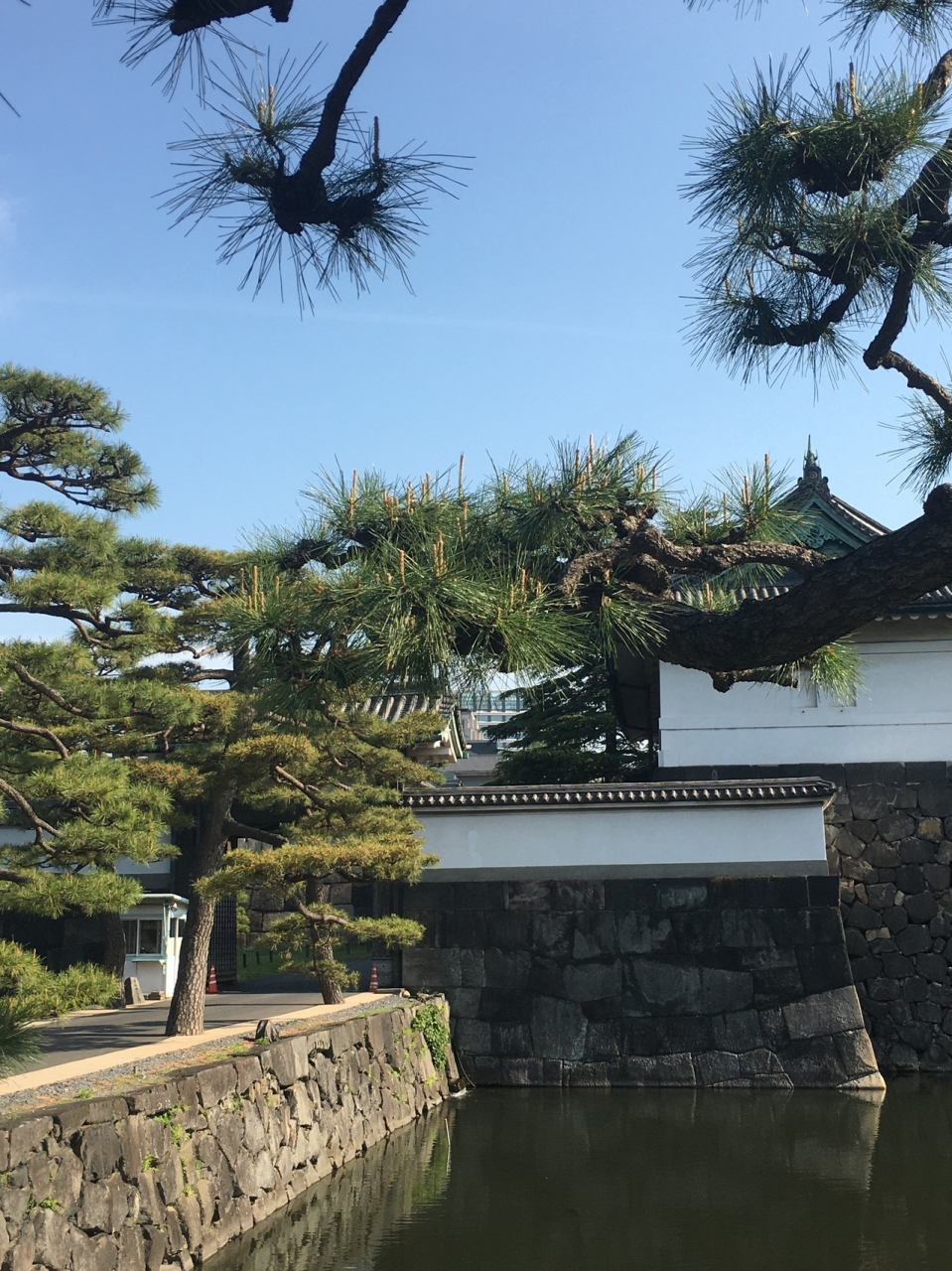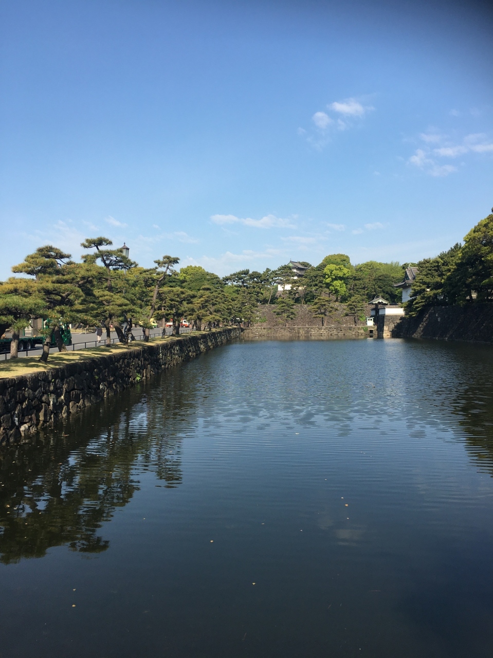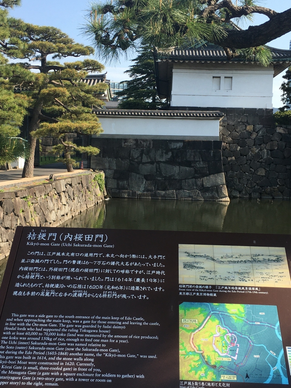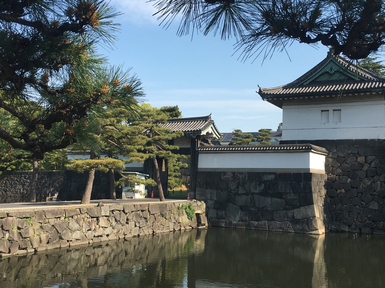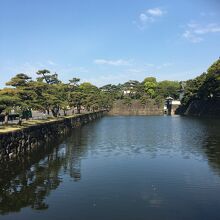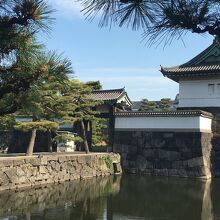 桔梗門に繋がる橋で、門までは歩いても1分もかからない短い橋です。端の手前には警備員がいて、橋を渡ることが出来ず、手前にての見学となります。濠に架けられた橋で、石垣の作りで濠を遮るように横たわっていました。