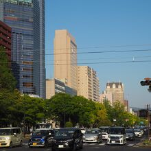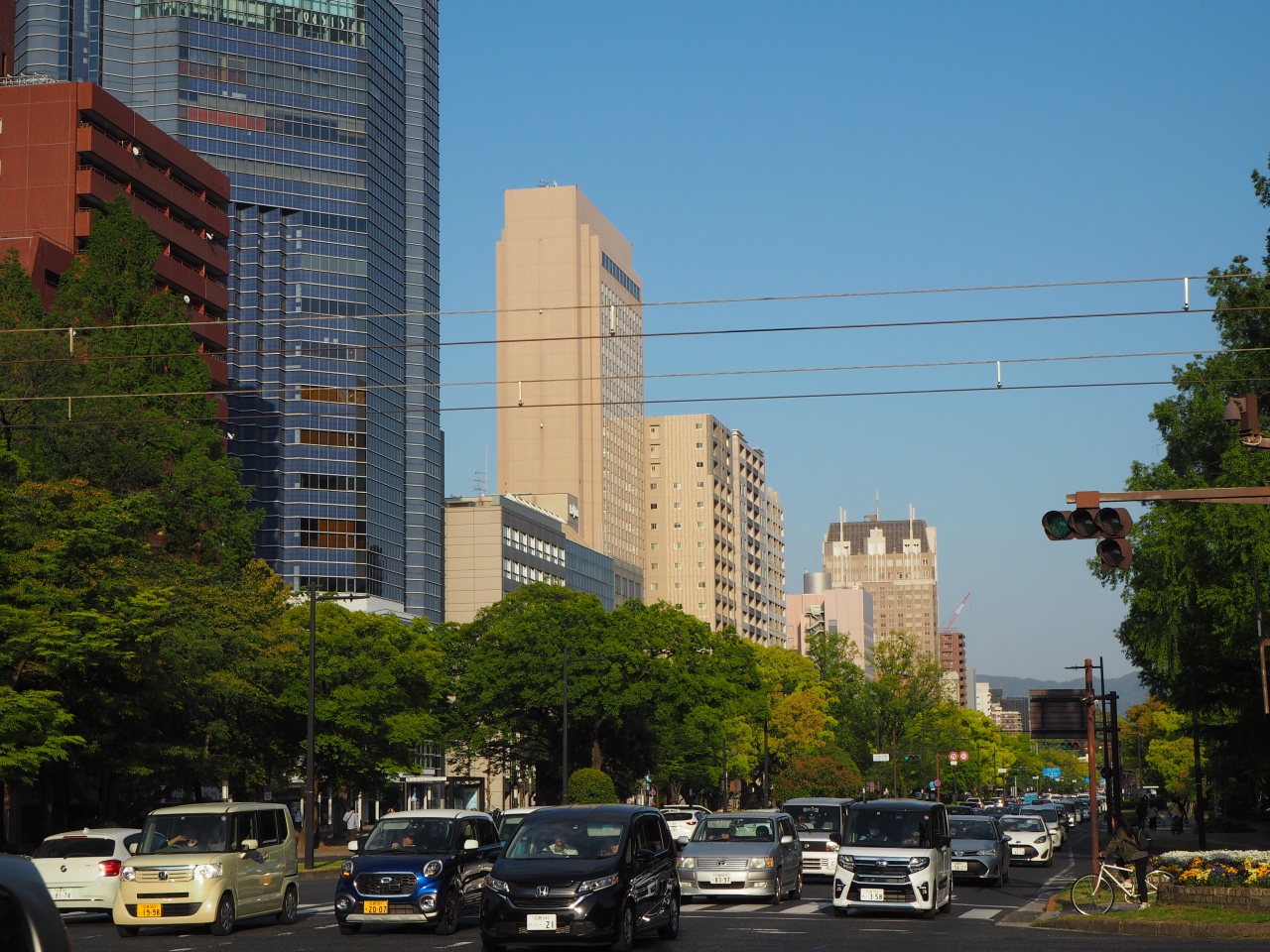 平和大通りは広島市街地を東西に結ぶ道路で平和記念公園の南端も通っています。道幅は100メートルほどあり、100メートル道路とも呼ばれています。歩道や分離帯はきれいに整備されて、木々が植えられており、見た目もきれいな通りです。広島を代表する幹線道路なので交通量は多いです。