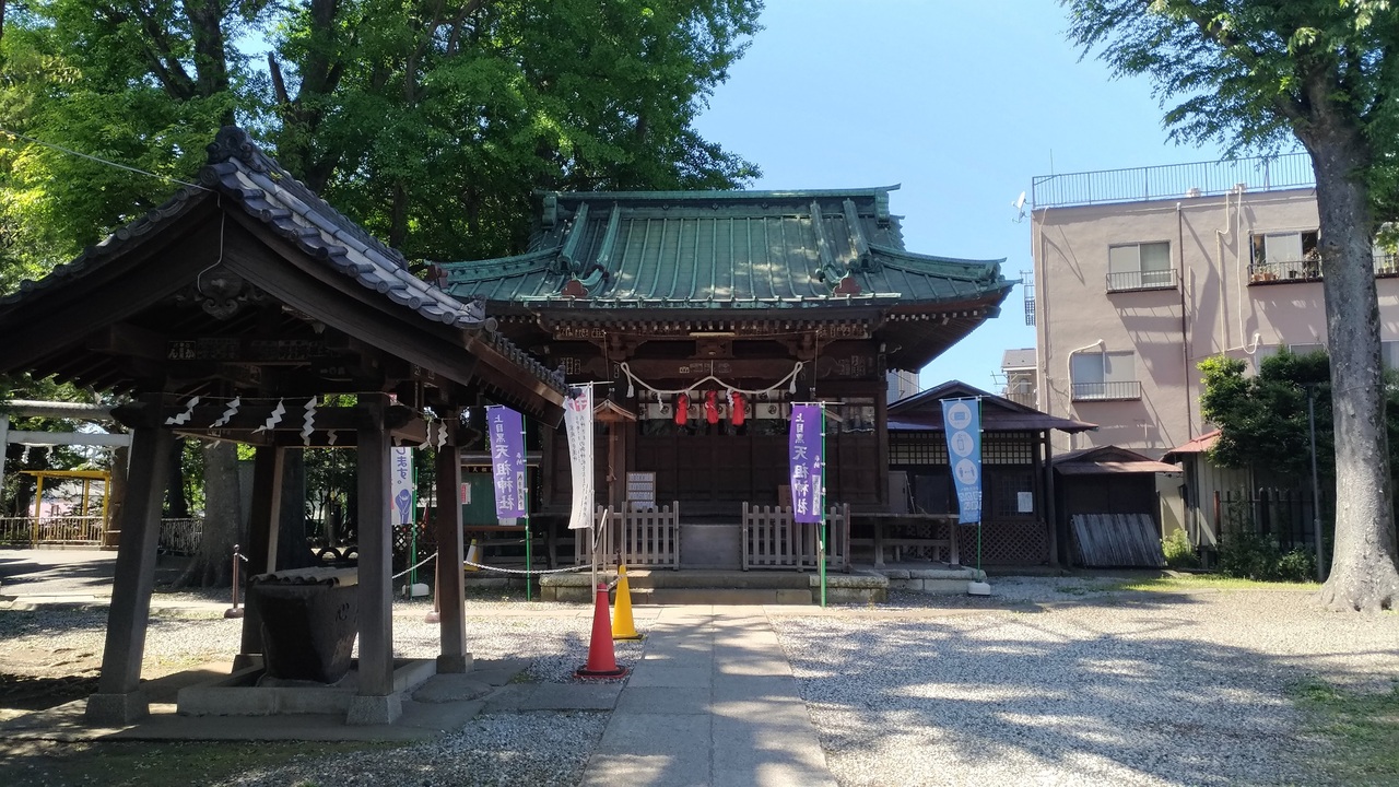 中目黒の駅から駒沢通りを進み、区庁舎の先に鳥居が見えてきます。本殿は奥まったところにありますが、境内は公園に隣接しているため思いの他、広く感じます。周りは閑静な住宅街なので、ひっそりと鎮座していました。