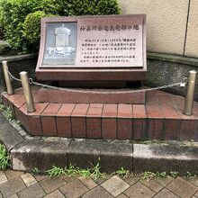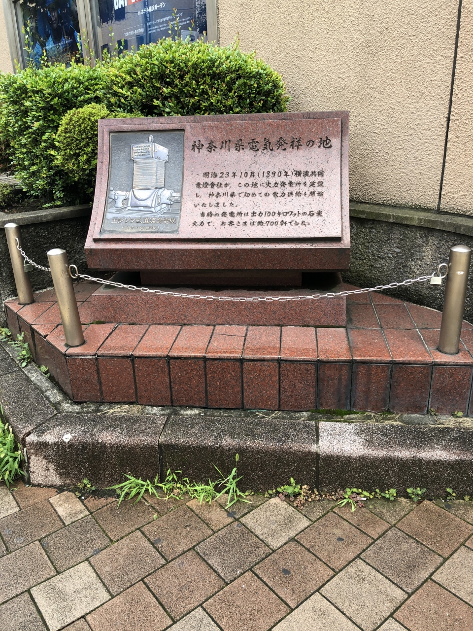 ベイスターズ通りにあるモニュメントです。説明文のほかにエジソン式直流発電機のレリーフもついています。この場所に火力発電所があったそうです。明治23年当時このあたりがどのような街並みだったかはわかりませんが、町中に火力発電所があるというのにはちょっと驚きました。