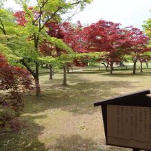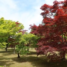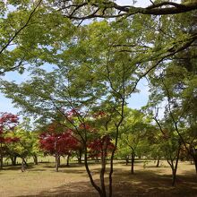 岡山後楽園の井田の南側に楓の木々が植わる場所があります。そこが千入の森です。本来時期的には秋の紅葉の時期が一番良いのでしょうが、春先でも新緑が色付いた楓の緑と、赤い葉の楓のコントラストが結構綺麗でした。紅葉の時も訪れれ見たいですね。