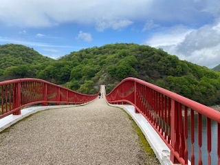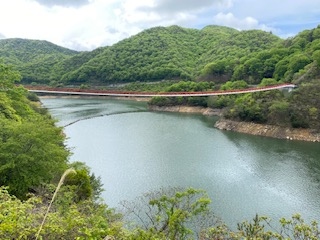 八田原ダムのダム湖(芦田湖)にかかる橋で、真っ赤な欄干が特徴的な橋です。吊橋という呼び名であるのですが、想像する様な支柱は無く、吊床版橋という構造の橋との事です。橋の上に立ってみましたが、高いところが苦手な方は、渡るのを遠慮した方がよさそうです。