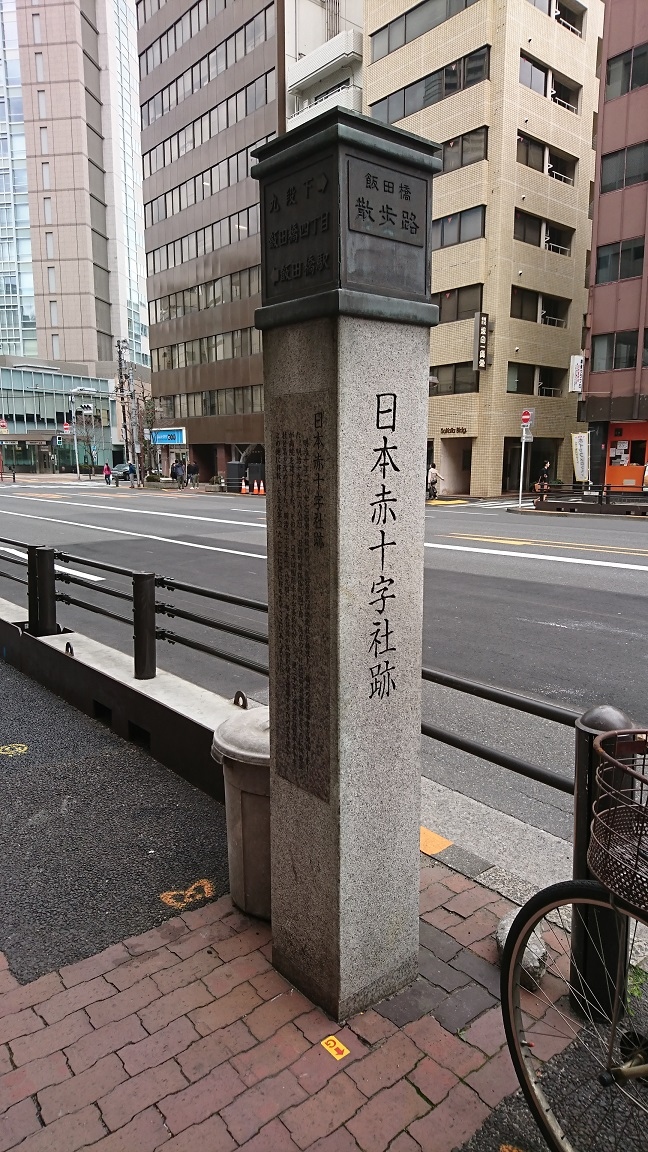 飯田橋駅と九段下駅を結ぶ目白通り沿いにある歴史標柱の一つです。明治19年(1886年)現在の飯田町駅付近に建てられた日本赤十字社の前身にあたる博愛社病院が、明治27年(1894年)この場所に移転したそうです。目白通り沿いには同じデザインの標柱がたくさんありますので、一通り巡ってみるのも楽しいものです。