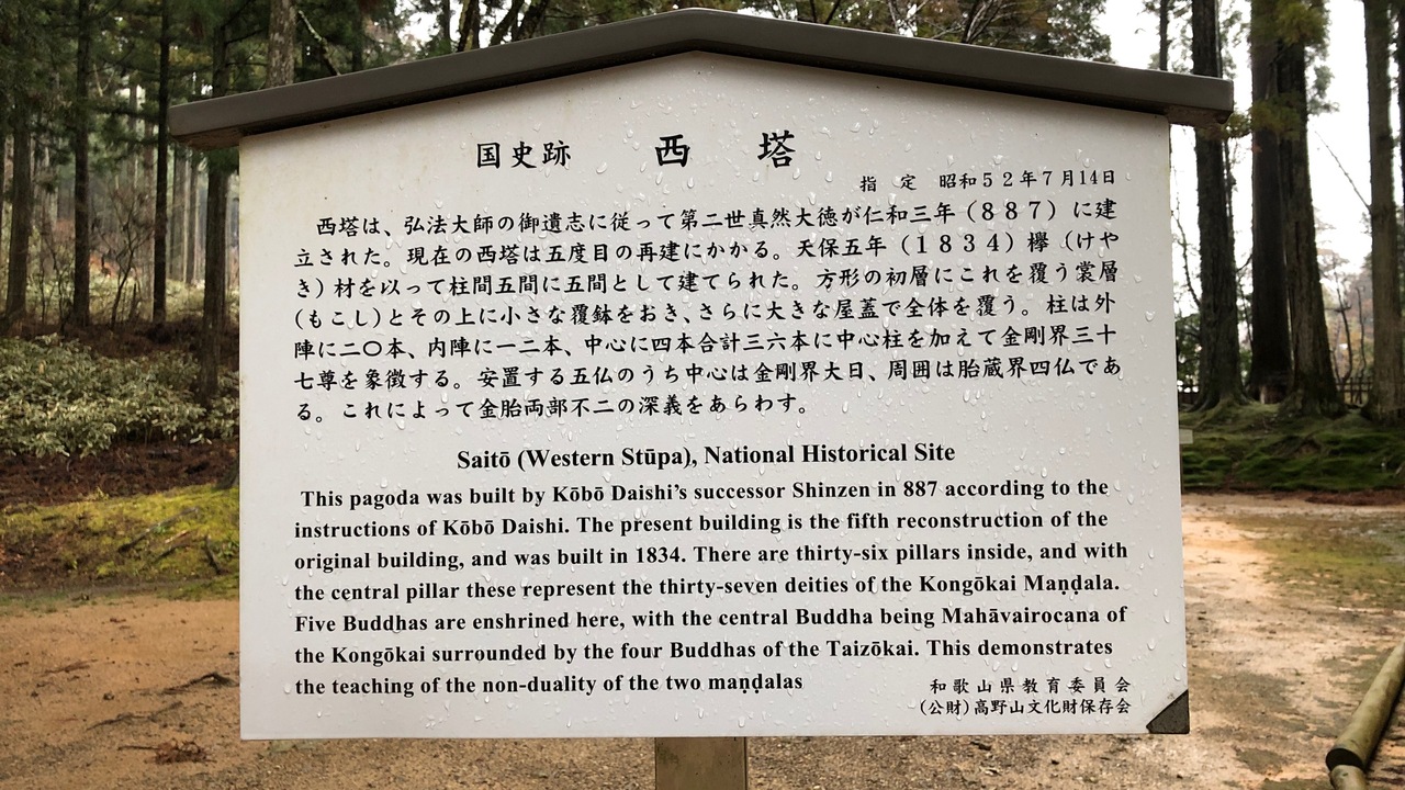 金剛峯寺にある塔です。下層部が角柱、上層部が円柱というつくりは、根本大塔に似ています。ただし、根本大塔が朱色なのに対し、西塔は木材そのままの色です。京都にある金閣寺と銀閣寺のようだなと、個人的に思いました。