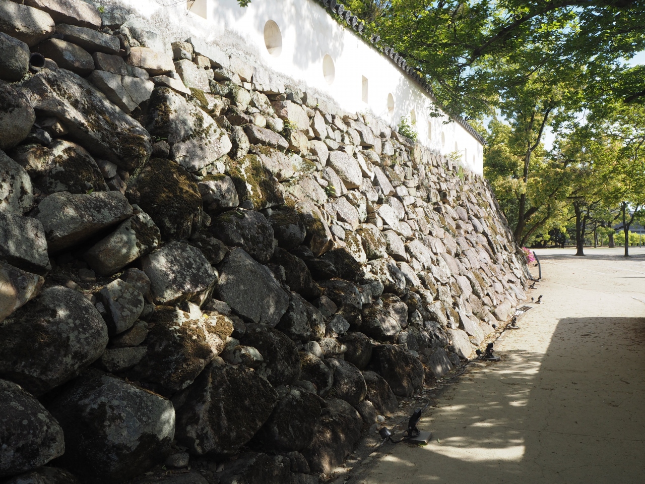 岡山城は3つの家、宇喜多家、小早川家、池田家などの城主の居城でしたが、それぞれの時代ごとで石垣の積み方などが違うようです。見る場所により違いがるので、注意深く見てまわるとわかるのもあります。不明門に入る敷地の場所には石垣の説明した場所もあります。、