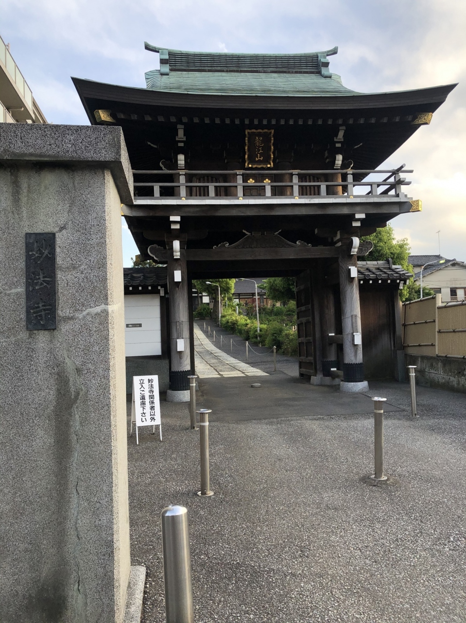 三崎坂に続く道から山門をくぐると長い参道が続きます。日蓮宗のお寺です。この広いのですが隣に大きなマンションが立っており、うなぎの寝床のような形になっています銅板の青い屋根がとても美しく見えました。本殿周囲にはお墓が広がっており、静かな景色が広がっていました。