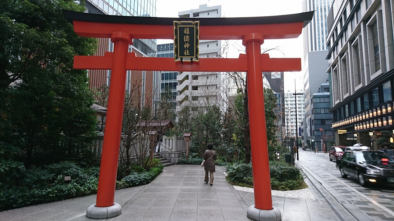 中央区日本橋室町の商業施設・コレド室町2の裏手に鎮座している神社です。武蔵野の福徳村に創建され、慶長年間(1596年~1615年)に現在の場所に遷座されたそうです。富くじの販売を許された数少ない神社で、富くじを求める人で大変な人気だったようです。長い間工事をしていましたが、近代的な神社に生まれ変わっています。