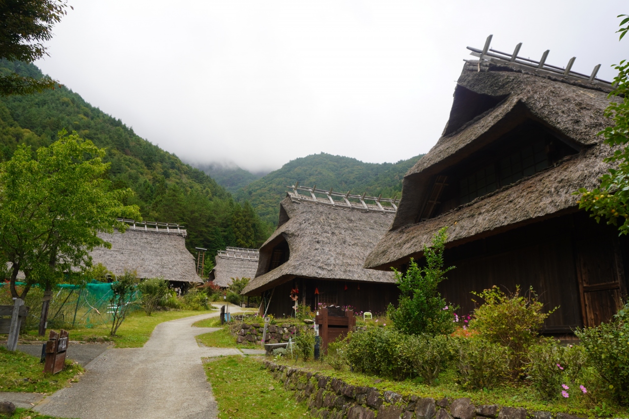 西湖いやしの里根場は、20棟ほどの茅葺き屋根の家屋を配して、昔懐かしい日本の原風景を復元した観光集落。あまり期待はしていませんでしたが、なかなか規模も大きいし本格的な施設ですね。川の両側に並んだ家屋の迫力はちょっと想像以上でした。施設内には食事処・甘味処もあるし、けっこう時間をかけてゆっくり楽しめます。