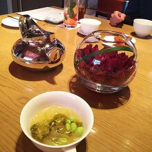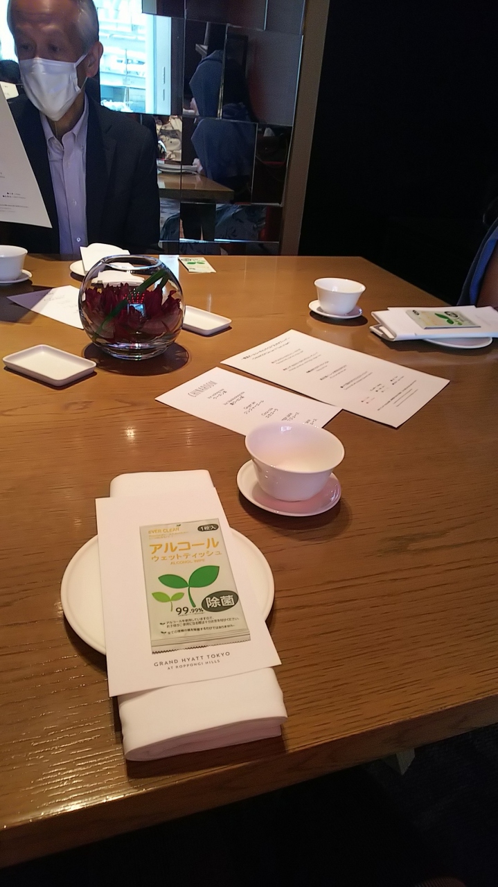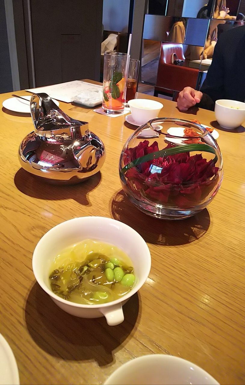 6階のオープンエアの気持ち良い通路を抜けた突き当り。ワクワク感いっぱいで入りました。チャイニーズレストランですがとてもスタイリッシュな店内。ん?通路が裏方みたいな所だったのは何故かしら。着席してから係りの人の一通りの説明がなかなか無かった。どうしたらいいものかと待ち時間が長すぎる。とりあえず何か一言必要なのでは?