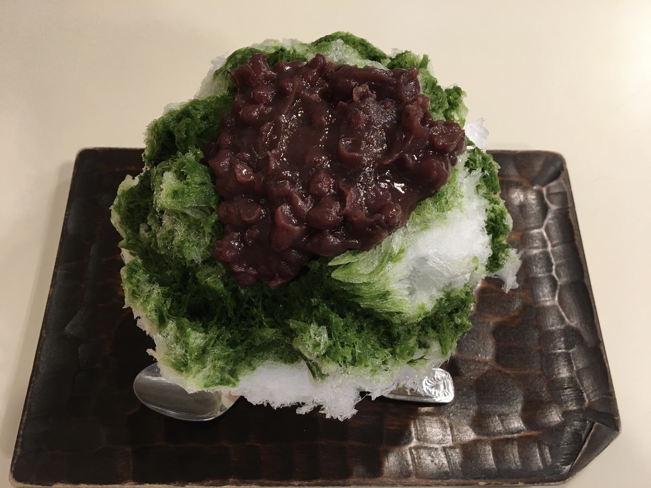 十条駅北口を出て、十条銀座商店街を真っ直ぐ歩くとお店があります。祝日のおやつ時間、午後3時に来店。店内はお客さんがいませんでしたが、柏餅は売り切れのサインが出ていました。カキ氷がお目当てだったので入店。抹茶はいろいろグレードがあって迷います。初心者なので宇治金時(1200円)をオーダー。抹茶がキュッと渋くて本格的な味がします。途中で甘さがもっと欲しくなってきたところで、底に餡子が隠れていたのを発見。最後まで美味しく食べられました。