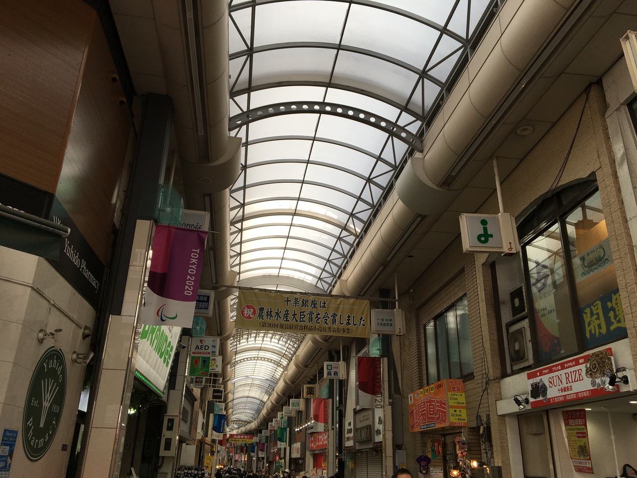 十条駅北口を出るとすぐ目の前に「十条銀座」のアーケードが見えてきます。テレビドラマ「孤独のグルメ」で取り上げられていた、だるまや餅菓子店に行くためにやって来ました。祝日の午後は人通りが多く、賑わっています。八百屋、魚屋、パン屋さんの他に韓国、インドなどいろいろなお惣菜も売っていてワクワクする商店街です。