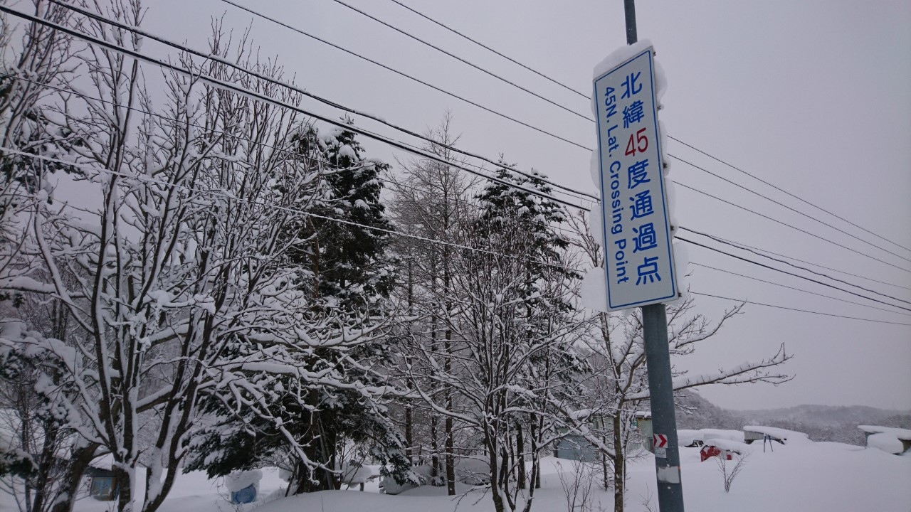 道道106号線のわきににあるモニュメントらしいです。何のために造られたものかわ、わかりません。探してみたけれど冬でもあり探せませんでした。道路を走っていると何か所かで「北緯45度」という看板を見たので、この近くかと思い探しましたが結局見ることができませんでした。看板だけで我慢します。