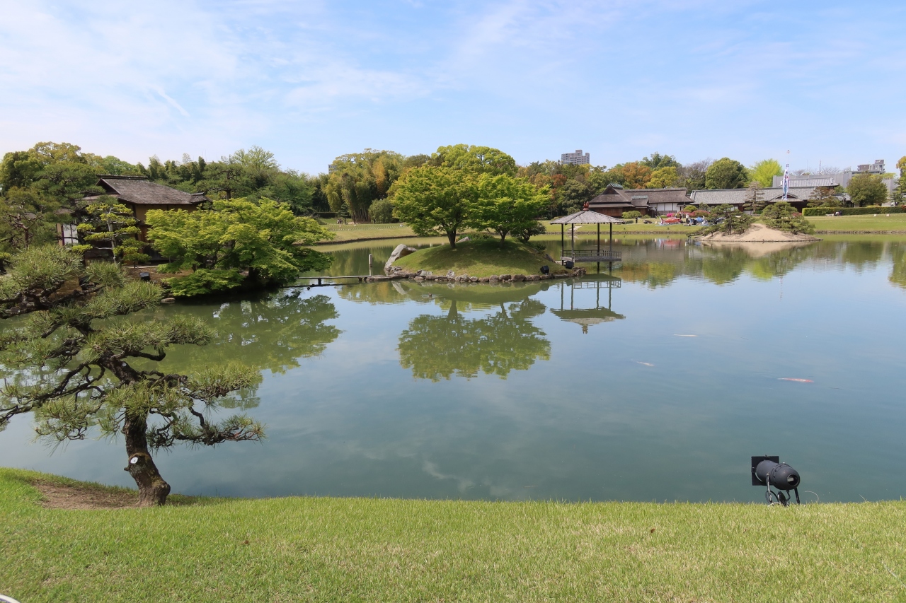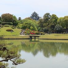 岡山後楽園の中心にある大きな池が沢の池です。沢の池には中の島、御野島、砂利島の3つの島が浮かび、錦鯉が泳ぐ大名庭園の核を成す池です。そのため、岡山後楽園の景色と言えば沢の池越しに岡山城を仰ぐ景色が良く使われています。