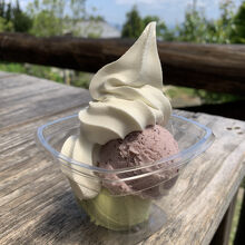 アイスは種類が豊富で訪問時は28種類ほど選べた。ソフトクリームも同時に食べたかったのでサンデー(ソース無し)にして、桑の実と大和茶のフレーバーを注文。アイスは甘さ控えめさっぱり系、濃厚なソフトクリームと相性抜群で美味。のどかで癒される環境も相まり、わざわざ出かける価値あり。
