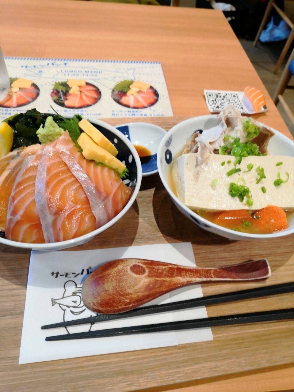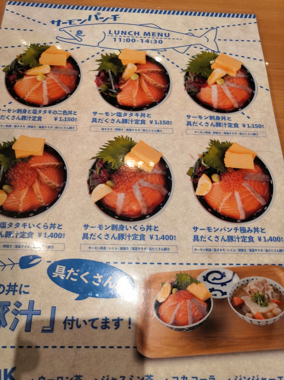 アスナルにあるサーモン料理のお店です。ランチで利用しました。オーバーはテーブルにあるコードを読み取ってスマホでするスタイルでした。刺身と塩たたきの二色丼をいただきました。付いてきた豚汁は量たっぷりでしたが、丼はやや具が少なく、値段的にはそれほどのお値打ち感はないかな。
