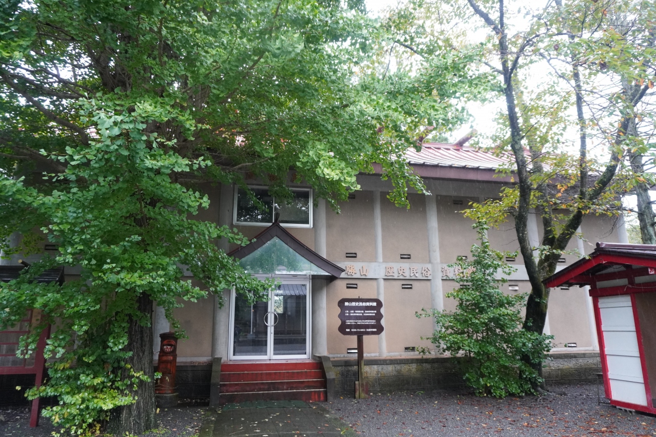 勝山村歴史民俗資料館は、御室浅間神社の境内。本殿の斜め前に建つどうかすると土蔵のような建物です。御室浅間神社が武田信玄の祈願所だったこともあって、レプリカですが信玄の安産祈願状を置いていたり、あとは昔の生活用具など。普段は閉まっていて、拝観は事前の申し込みが必要なようです。