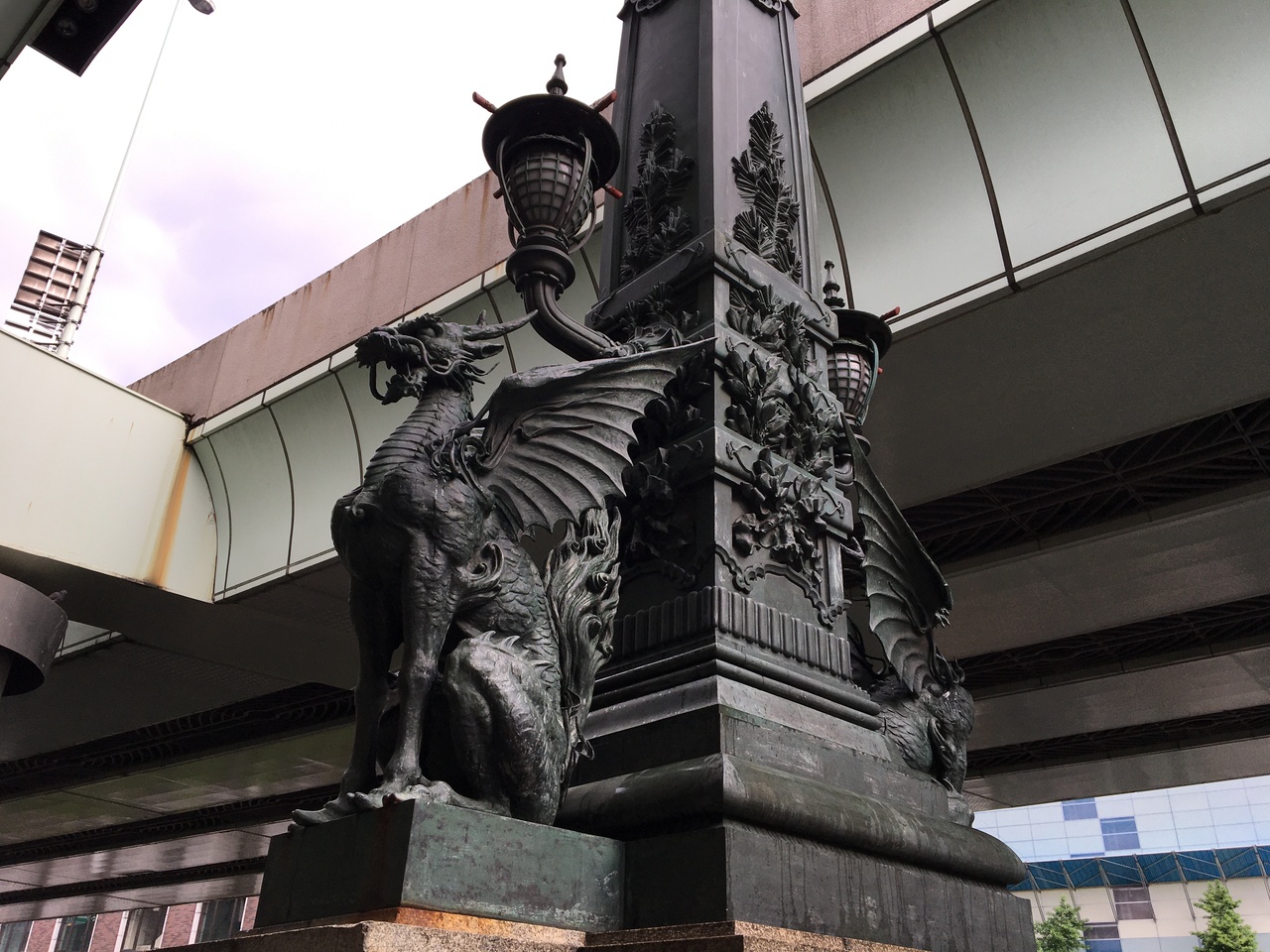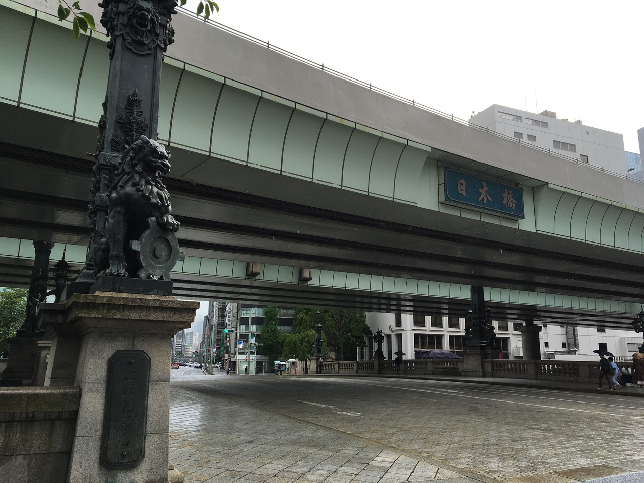 日本橋の名所。国道1号の橋で、東海道や中山道などの起点になっています。東野圭吾の小説に舞台としても有名。重要文化財に指定されているという、橋の入り口に立つ獅子や、中央柱の麒麟像が立派で堂々としています。人や車の往来も激しく、今も昔の賑やかさを伝えているようです。