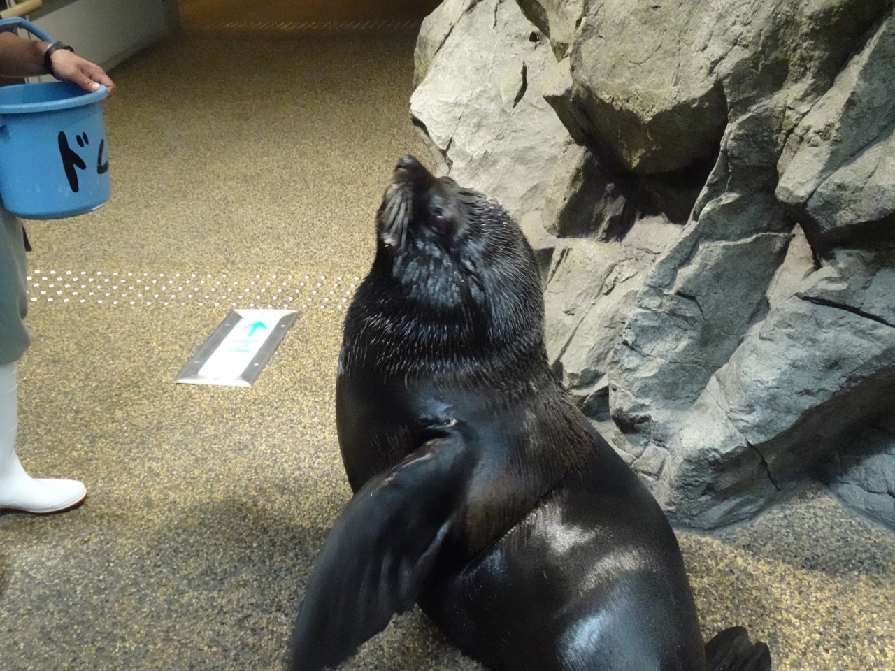 入館すると順路に一頭のトドさんが飼育員の方と一緒に出迎えてくれました。これはなかなかのサプライズ。