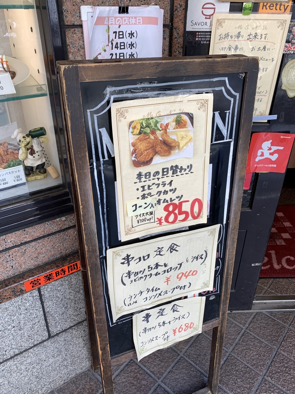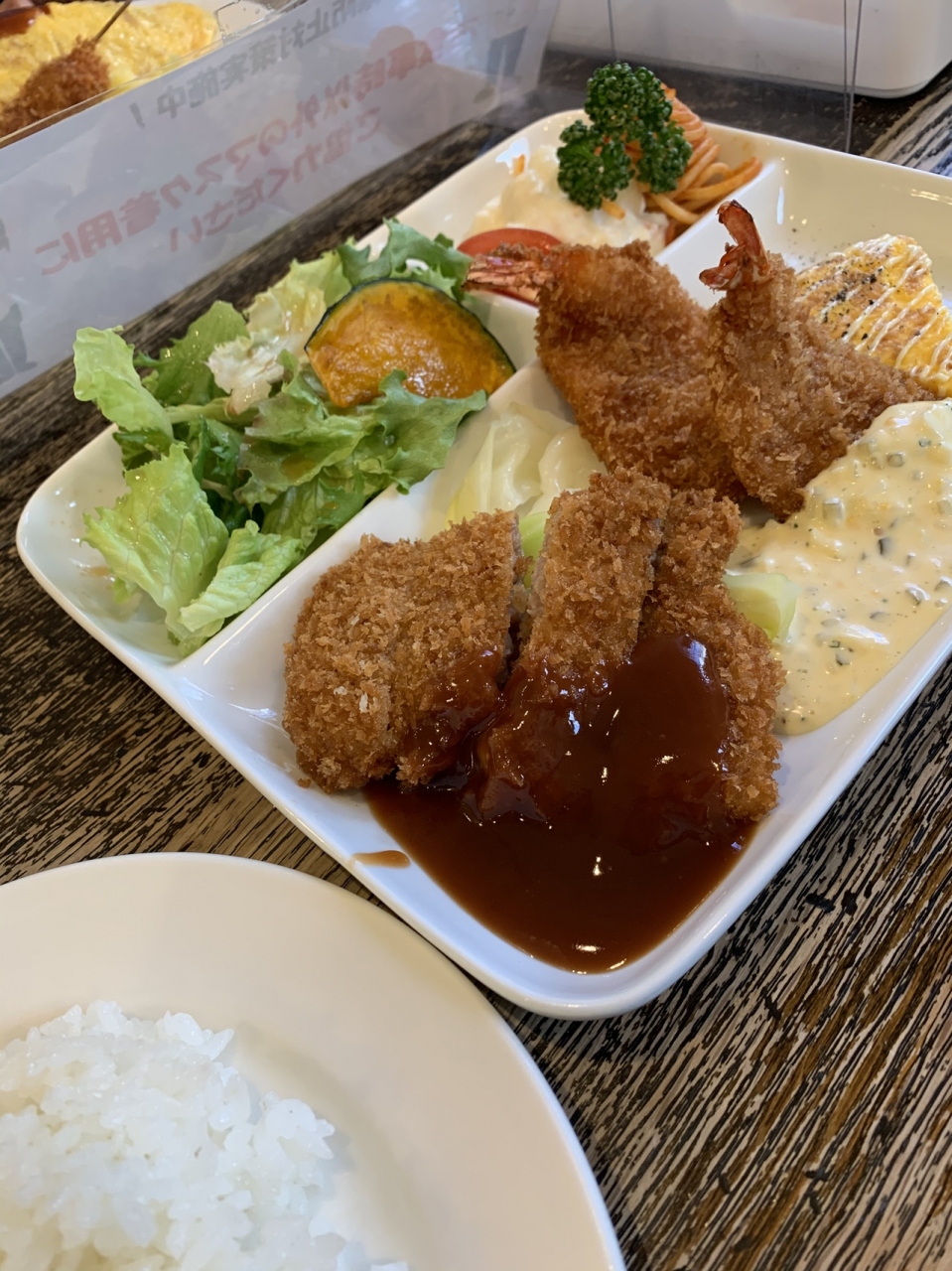 洋食店らしくオニオンスープが濃くて美味しい。エビは小さいが開いてサクッと揚げられタルタルが乗りやすい。ポークカツのソースも酸味が効いて美味しい。