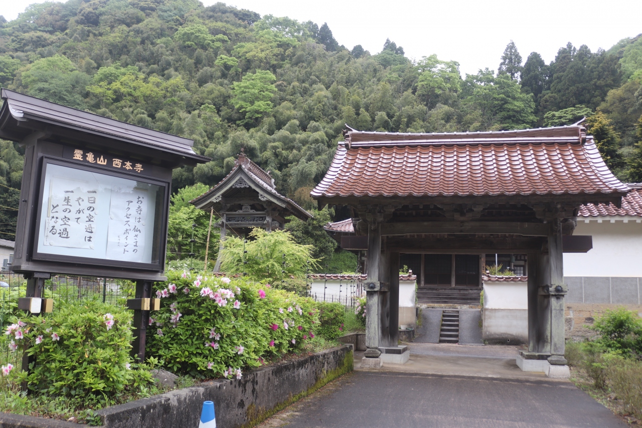 大森から龍源寺間歩に至る道沿いにある浄土真宗本願寺派のお寺です。入口には山吹城城門西本寺とあります。もともとは石見銀山を守るために築城された山吹城にあった門のひとつだったそうです。今も山門として見守っています。