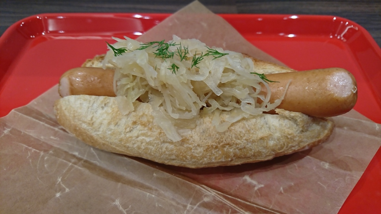 江東区有明の新しい大型商業施設・有明ガーデンの5階フードコートにあるサンドイッチやハンバーガーのお店です。ランチで片瀬山メッツゲライオジマフランクホットドッグ600円をいただきました。やや太めのフランクの上にサワークラウトののったホットドッグです。フランクもサワークラウトも美味しく、食べごたえはあったものの、600円という値段は、ちょっと高すぎの印象です。
