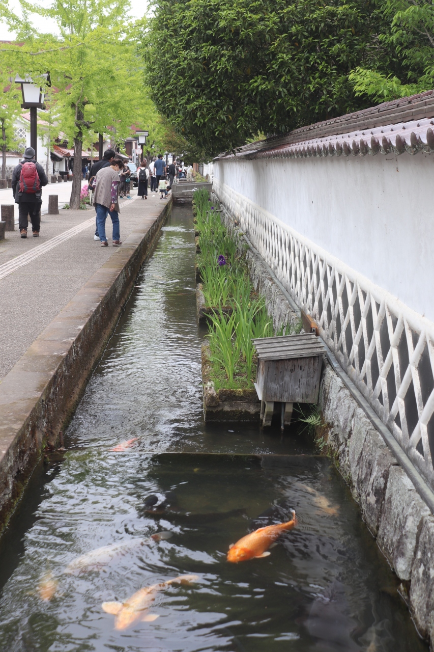 津和野駅から徒歩15分ほどの観光通り、白壁の土塀に面し通りの掘割にたくさんの鯉が泳ぐ景観は津和野を代表する風景です。コロナ渦2度目のゴールデンウイーク、ショウブの花も咲き始め、結構な観光客の人出でした。