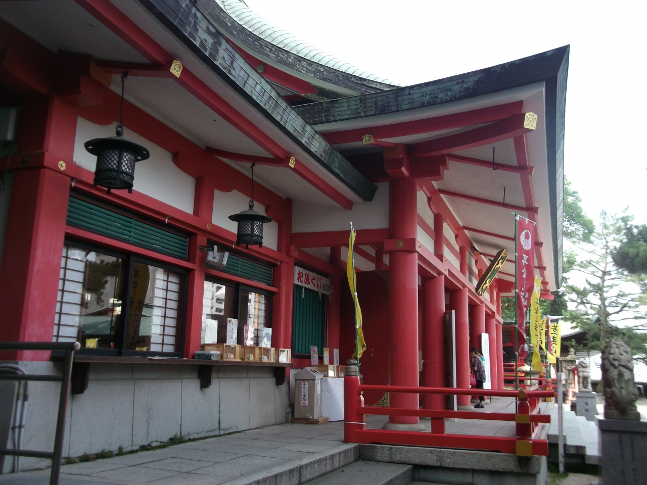 関門海峡に面する、下関の唐戸市場からほど近いところにある神社です。壇ノ浦の合戦で入水された安徳天皇を祀る神社で、社殿などの建物が、赤、白、緑の鮮やかな色彩なのが目を引きます。一見竜宮城のような雰囲気が感じられる不思議な神社でした。