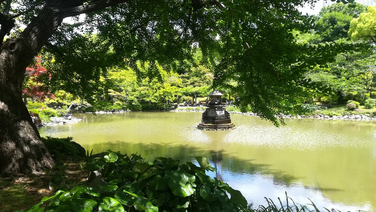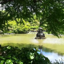 鶴の噴水があります、雲形池です。