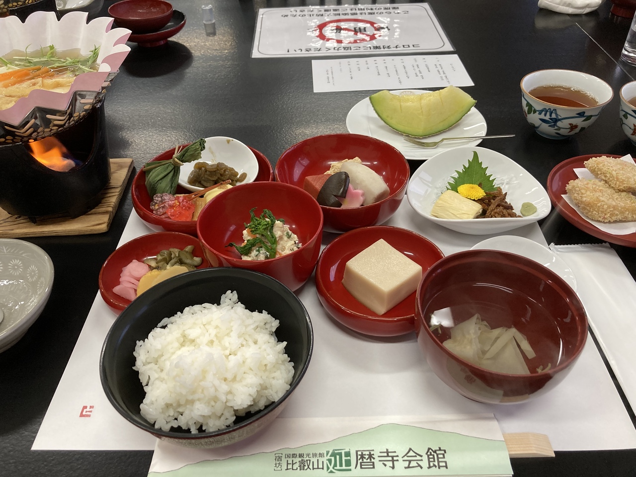 GWに延暦寺会館に宿泊したので、夕食に精進料理をいただきました。野菜と豆腐、ゆばが中心の料理で、体に優しく美味しかったです。