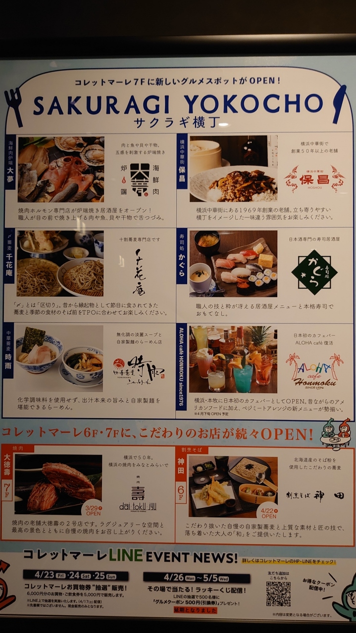 海鮮肉炉端の「大夢」は野毛の焼肉ホルモン専門店が炉端やき居酒屋として出店。十割蕎麦専門店の「千花庵」そして行列ができてた中華蕎麦「時雨」など。他にも横浜中華街から「保昌」が出店し、お洒落な「アロハカフェ」は