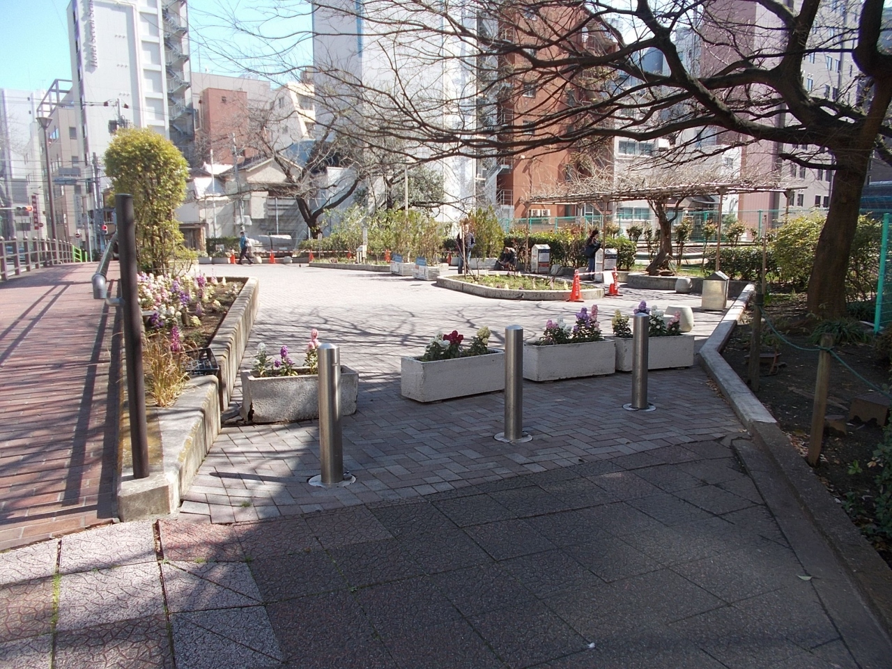 この楓川新富橋公園は地下鉄都営浅草線室町駅から南東に10分強の場所にあります。この公園はもとの楓川を埋め立てて高速道路になってそこにかかっている橋が整備されたのです。それにともなって橋の南側を高架の公園にしているのです。公園は簡素な印象です。