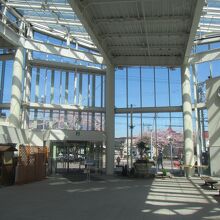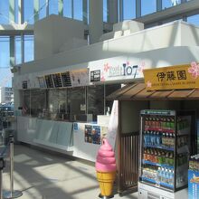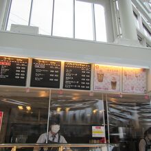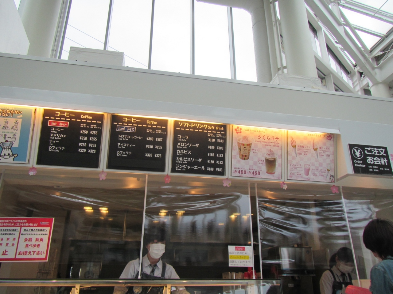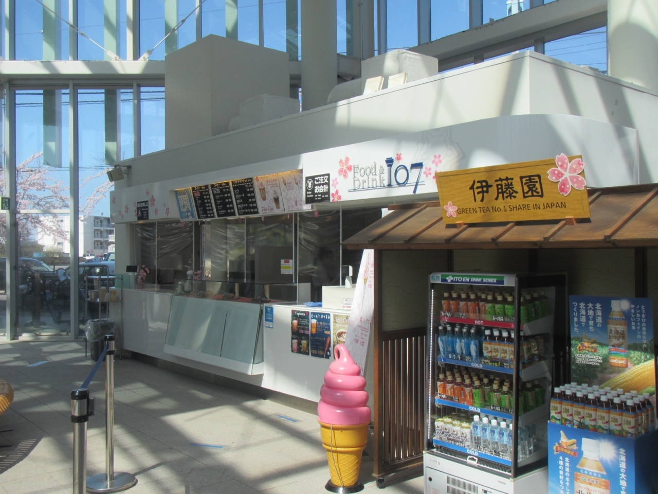 五稜郭タワー1階のガラス張りのアトリウム側にソフトクリームやコーヒー、ソフトドリンクを販売する小さな売店コーナーがあって、アトリウム内の各所に設置してある椅子に座って食べることができます。なお、お会計時に店内で食べるのか聞かれるので、アトリウム内でいただく場合、消費税が10%になります。