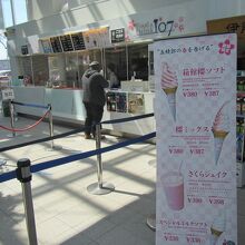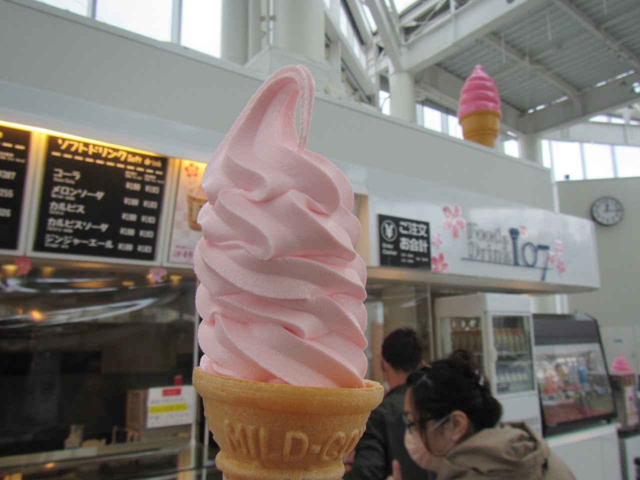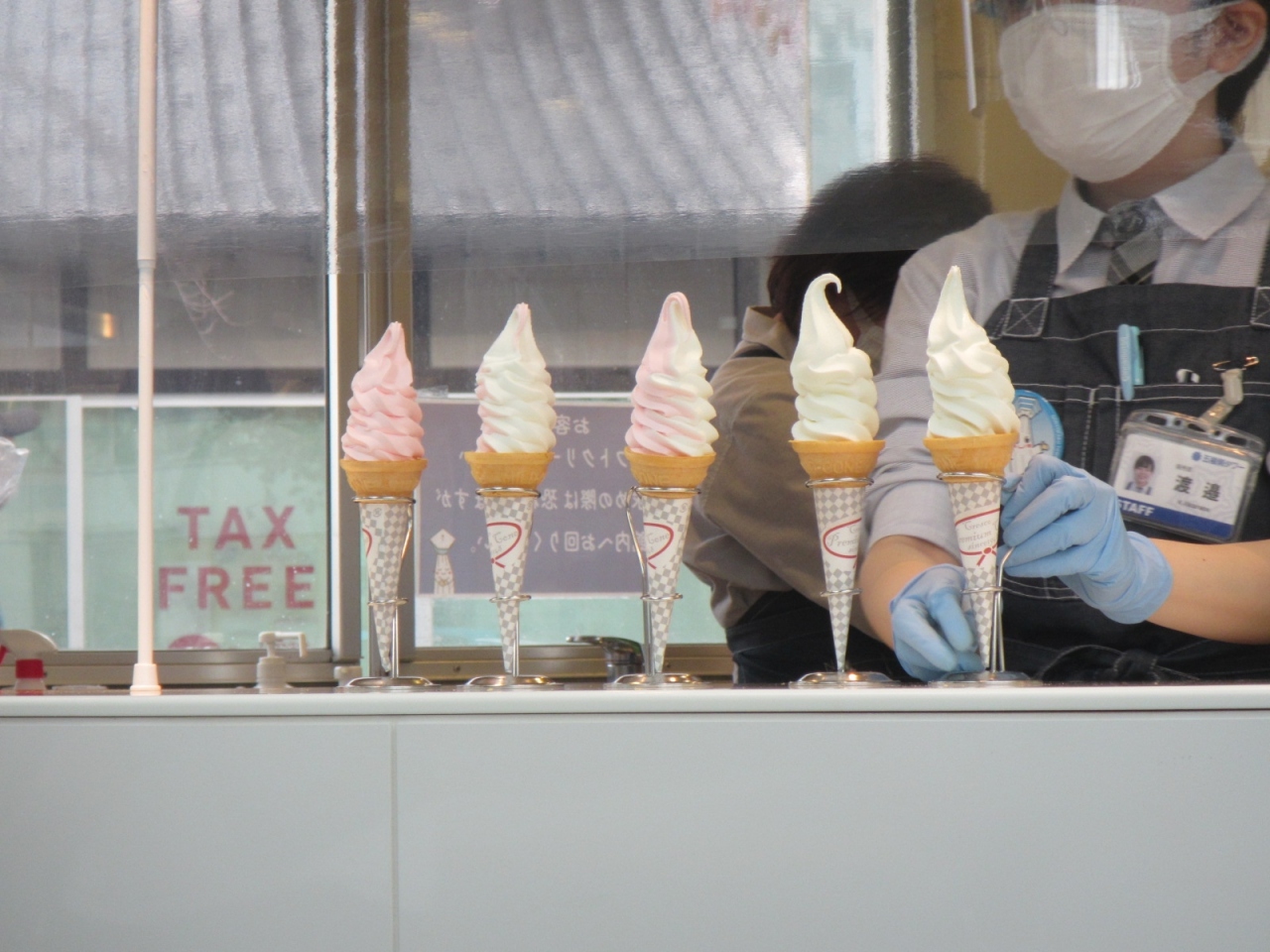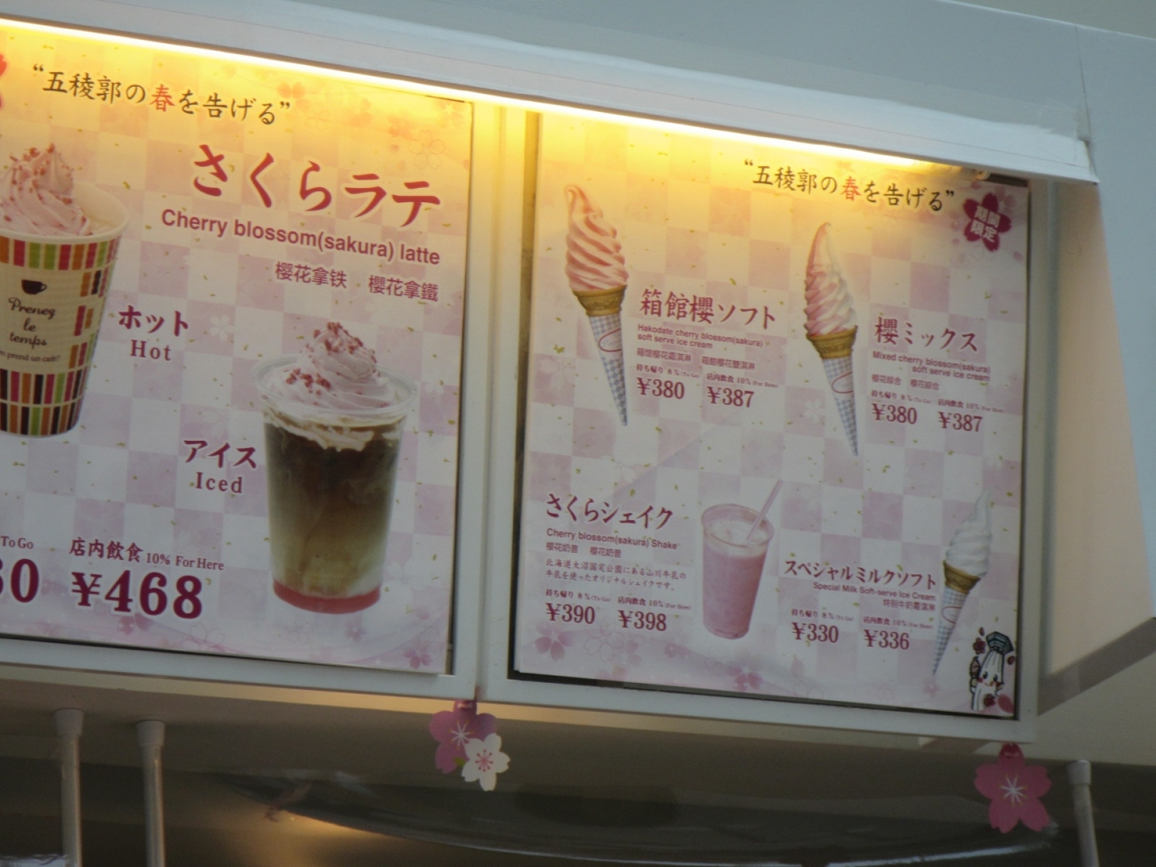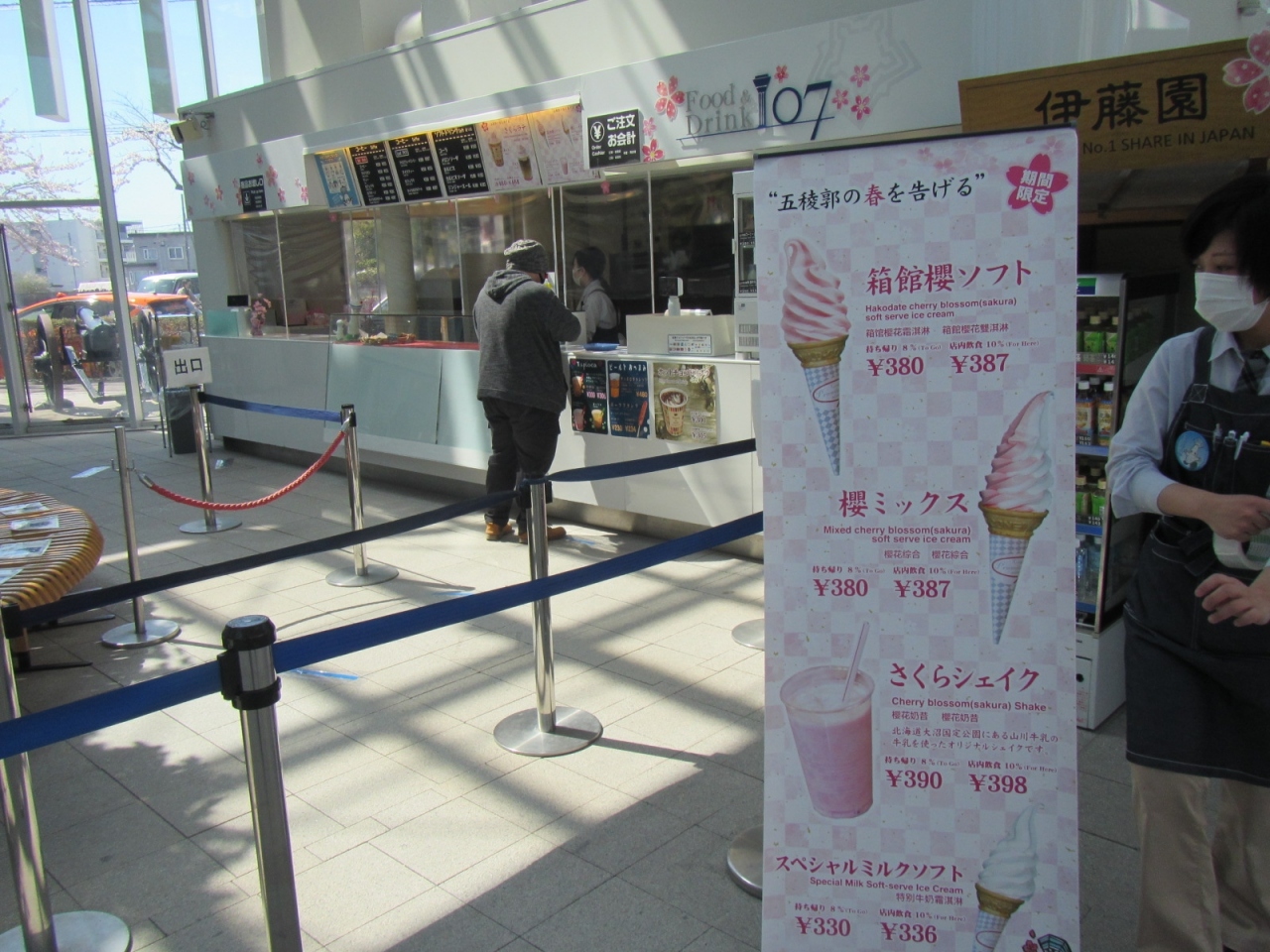 ソフトクリームは、2階にあるミルキッシモのアイスとどちらを食べるのか迷うところですが、4月に訪れたところ、1階の売店では桜風味のソフトクリーム”箱館櫻ソフト”(¥370円)を売っていました。外の満開の桜を眺めた後だったので、気分的にちょうどよかったです。ちなみに櫻ソフトは、この時は展望タワーに上がった展望階でも売っていたので、もしタワーに上がるなら、上の売店で買って、爽快な眺めを楽しみながらいただくこともできます。ただし、タワーの上では座れる場所はあまりありません。