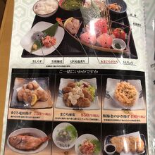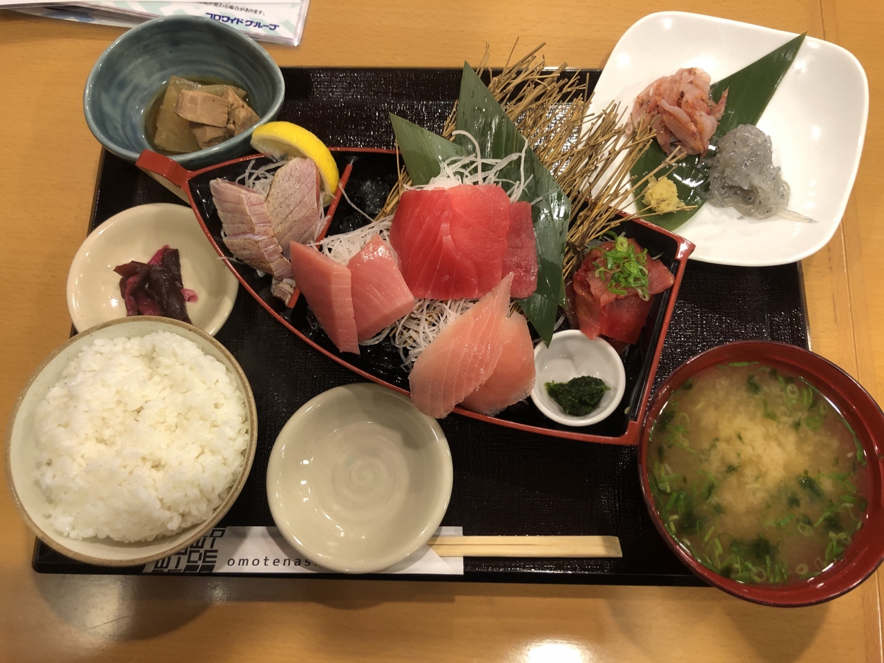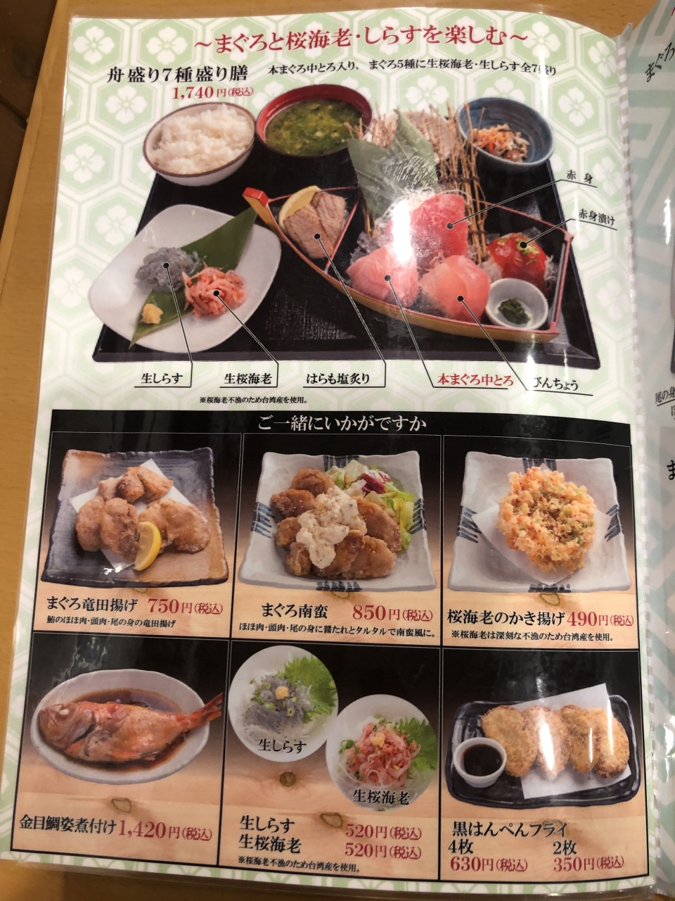 本マグロ中トロ、赤身漬け、びんちょう、赤身、はらも塩炙りの7種類。生シラス、生桜海老、小鉢付きで、いずれも少量だがいいメニューだと思った。