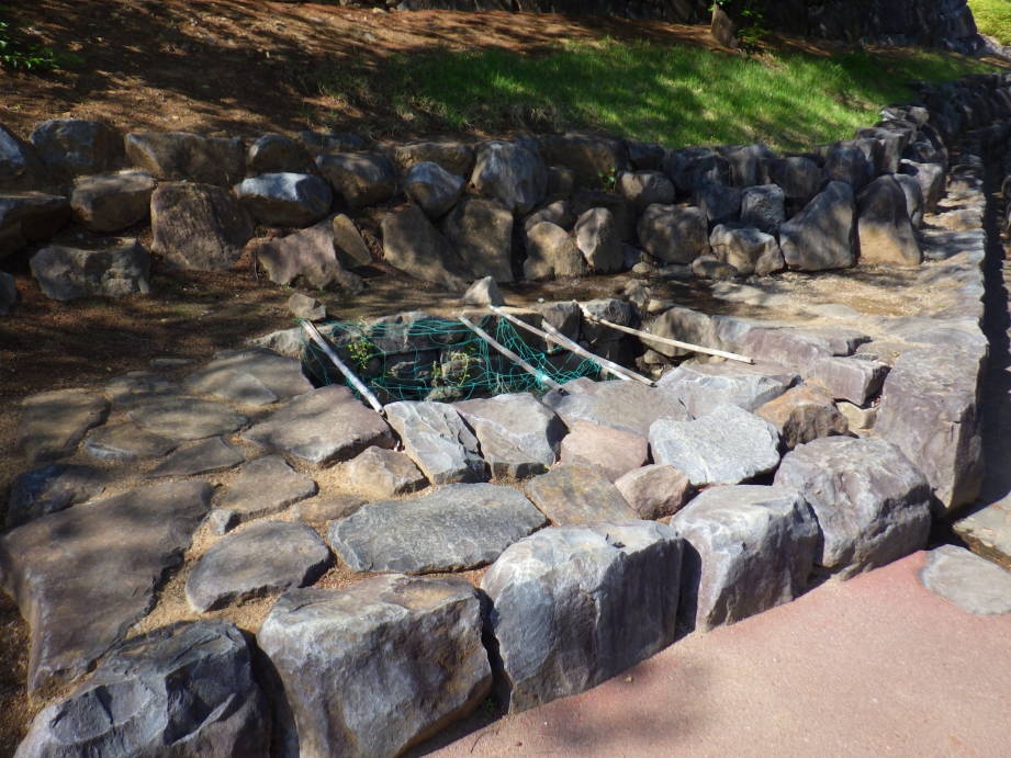 天守を目指して石段を上がっていくと、「水溜跡」がありました。発掘調査によって初めて確認された、水をためて置くところということですが、覗いてみると金魚がたくさん泳いでいたので、ただの小さな池にしか見えませんでした。